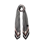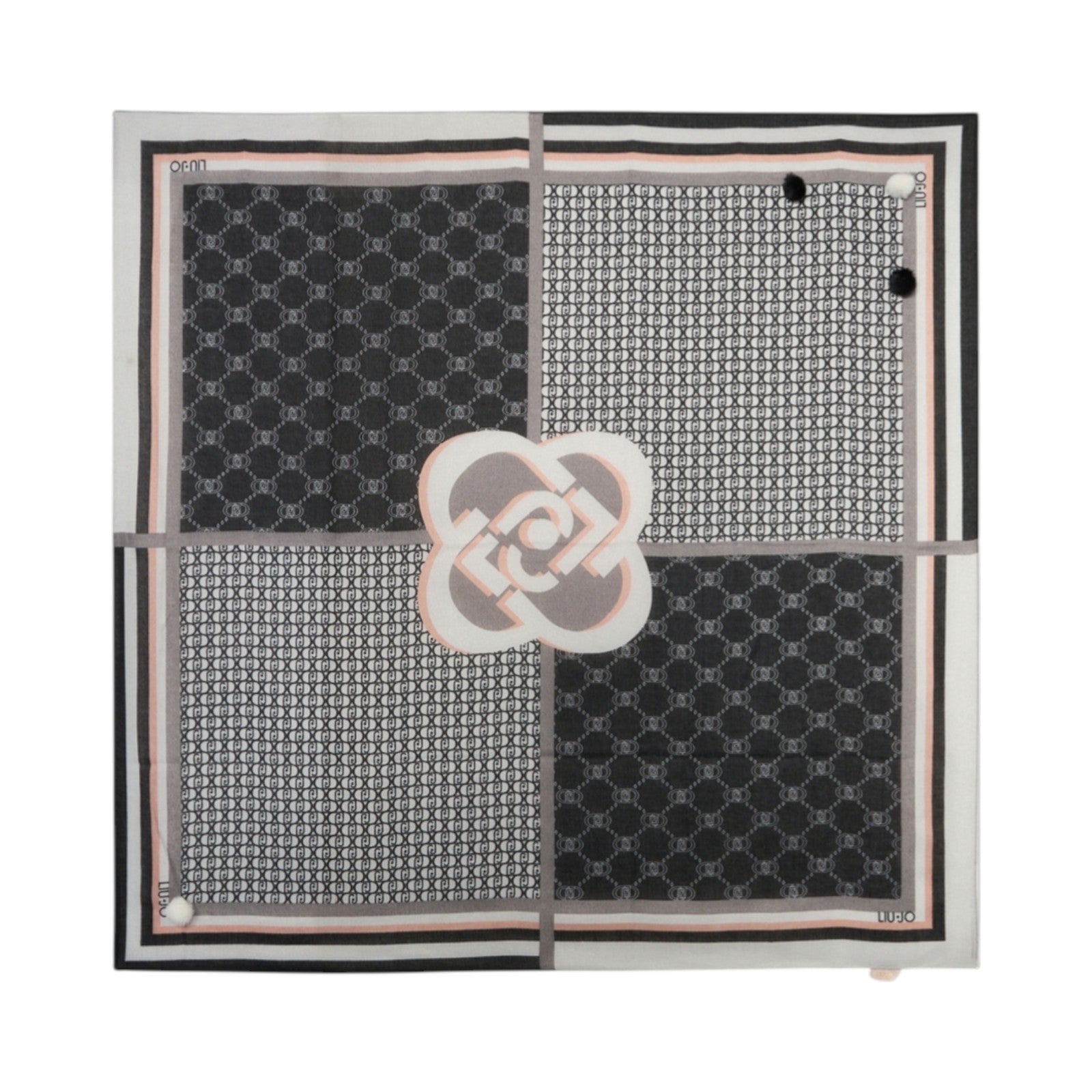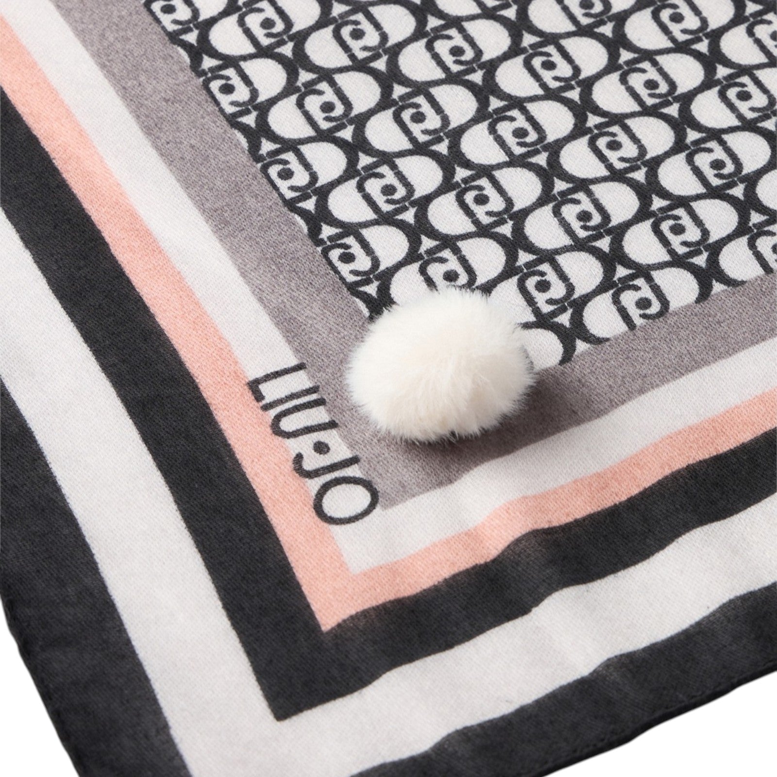 Misure: 120 x 120 cm. Foulard nero. Stampa logo patchwork con motivo a righe. Pompon applicati. Presenta pochette logata.