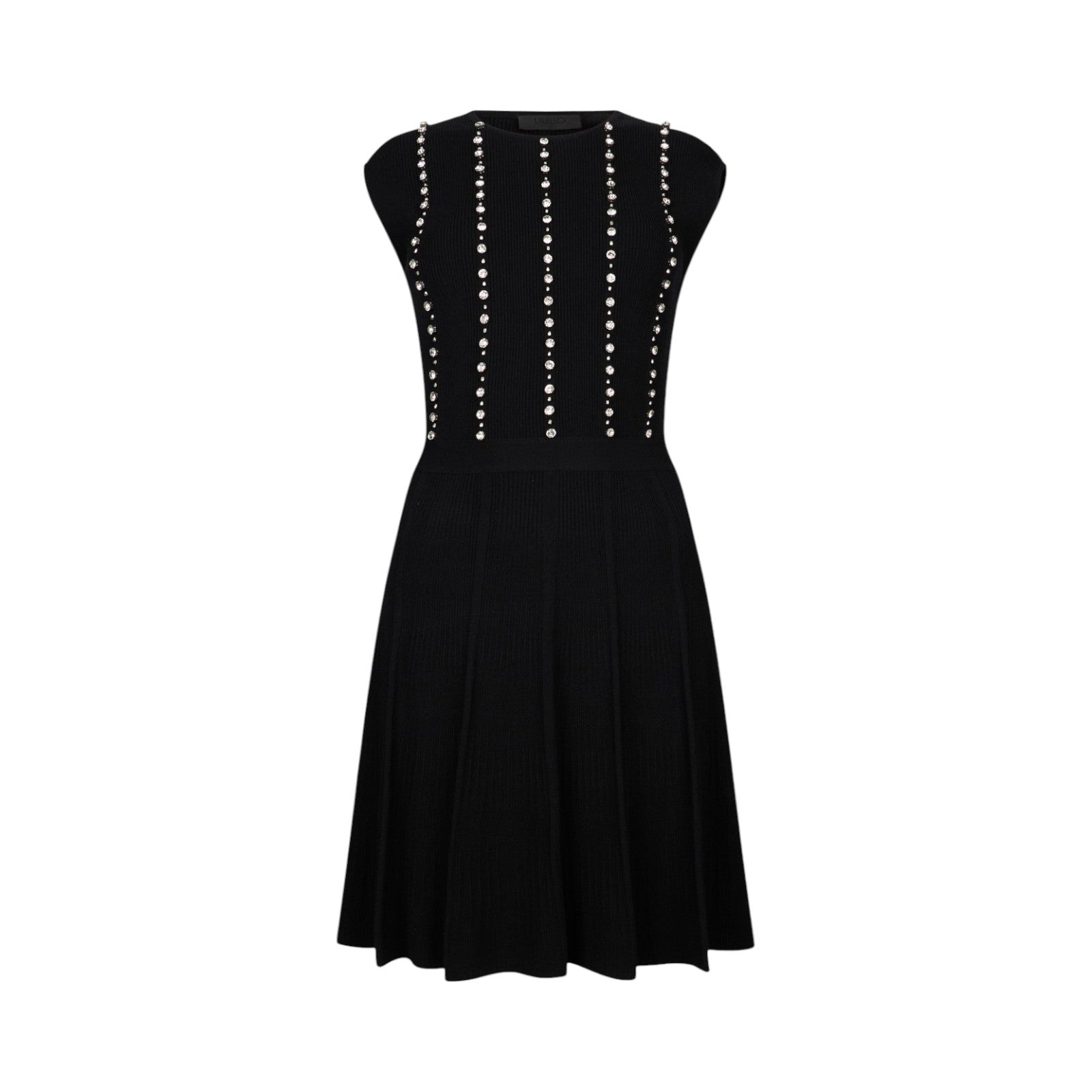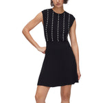 Vestito nero corto in maglia. Modello fit & flare. Filati in misto viscosa. Taglio accollato. Ricami gioiello.