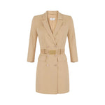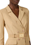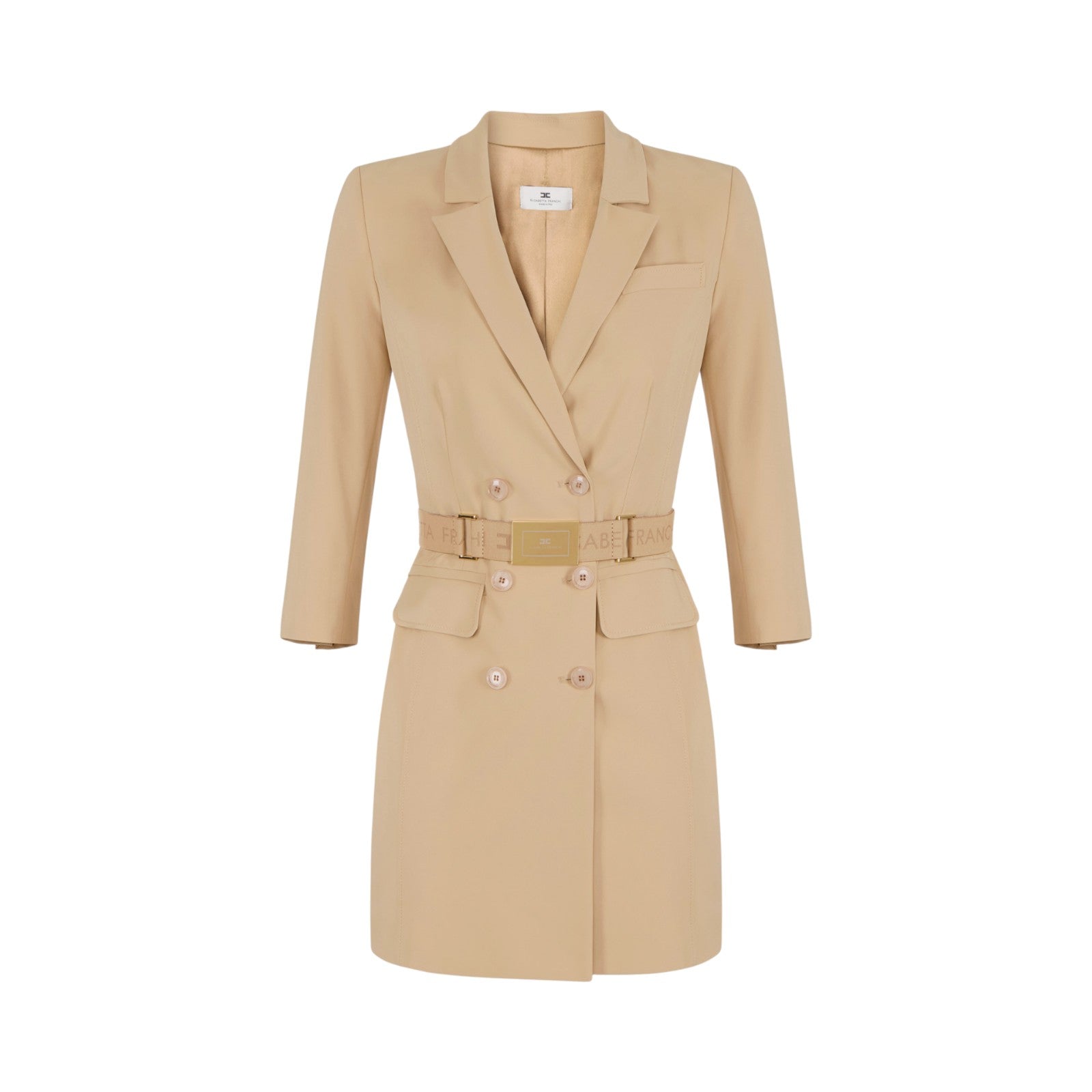 Abito in tessuto tecnico bielastico dalla vestibilità aderente. Il vestito ha spalle strutturate, rever con abbottonatura doppiopetto e maniche ¾. Focus sui dettagli: la cintura esalta il punto vita ed è illuminata dalla placca con logo a laser. A completare, taschino e patte applicate.