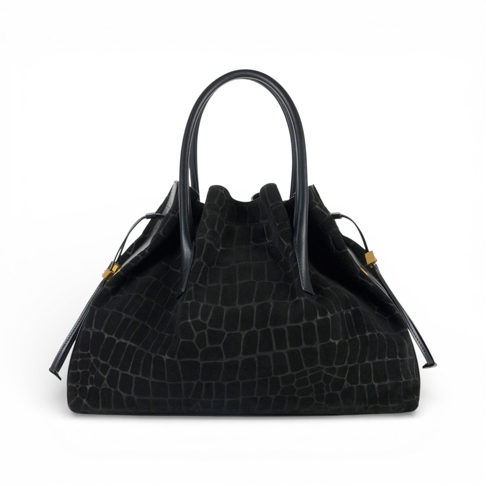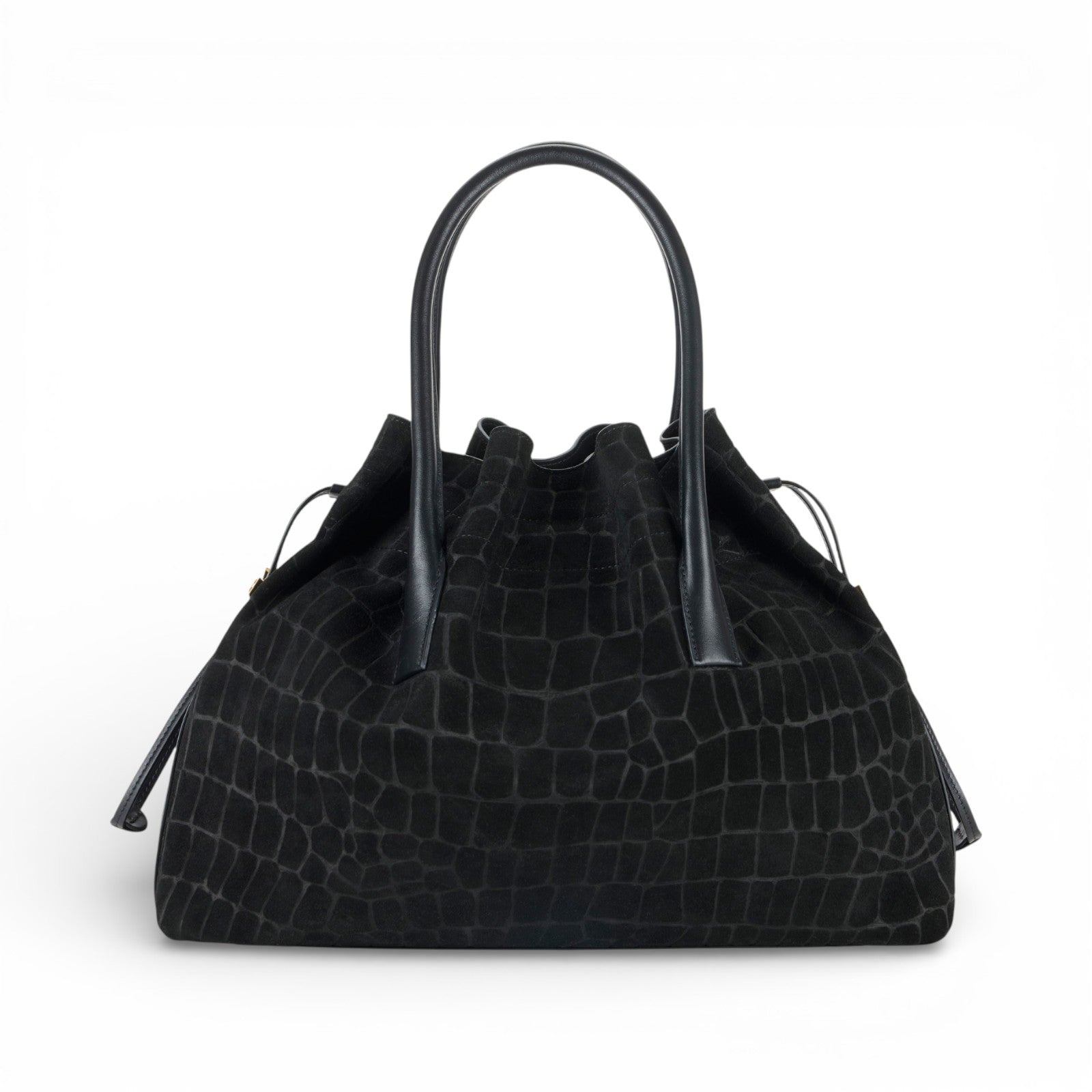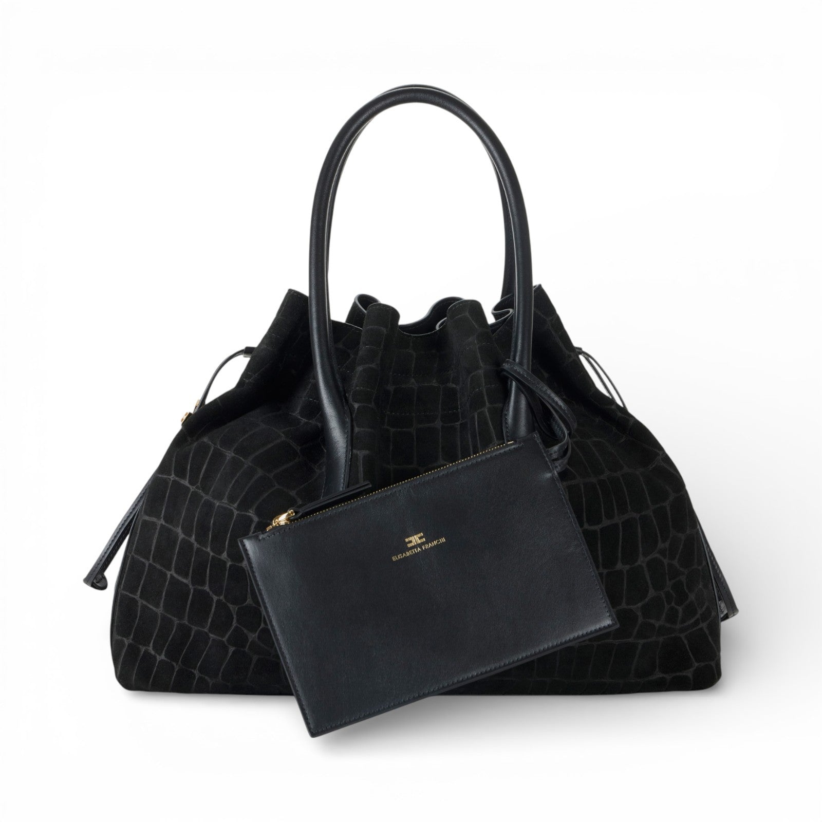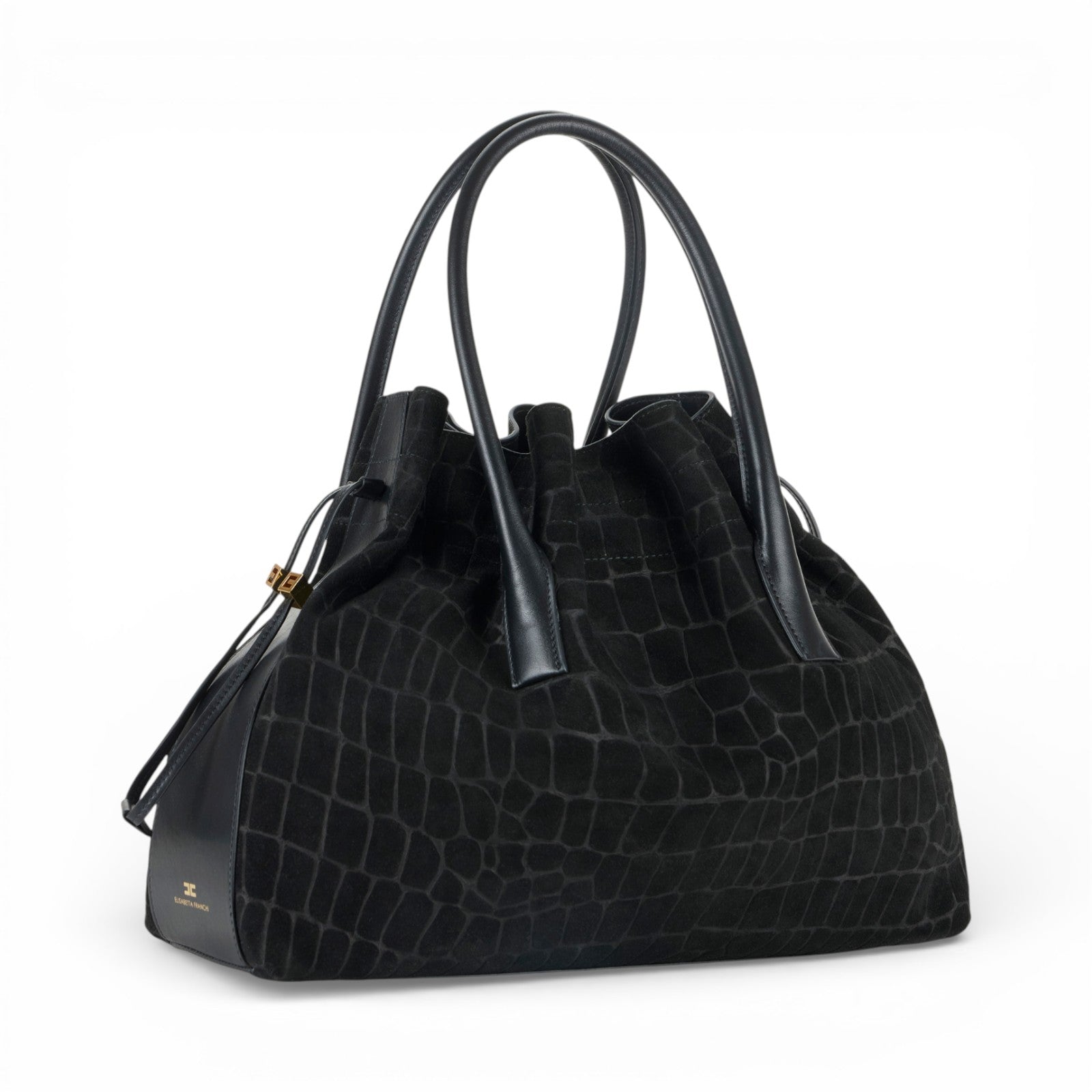 Borsa realizzata in suede di vera pelle con design a bauletto. Ha manici tubolari e chiusura con coulisse. Piedini al fondo.