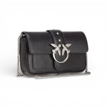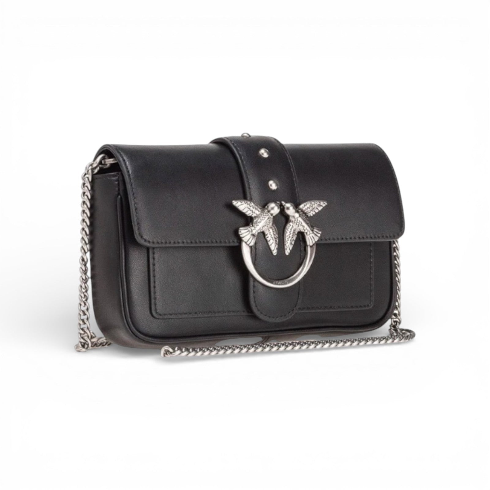 Pocket Love Bag One in morbida pelle mano seta. La chiusura con baccello in pelle e piccole borchie è completata da fibbia in metallo Love Birds Diamond Cut. L'interno è foderato in tessuto tecnico e comprende tasca con zip e spazi per carte di credito. Tracolla rimovibile a catena rotonda sottile in metallo.