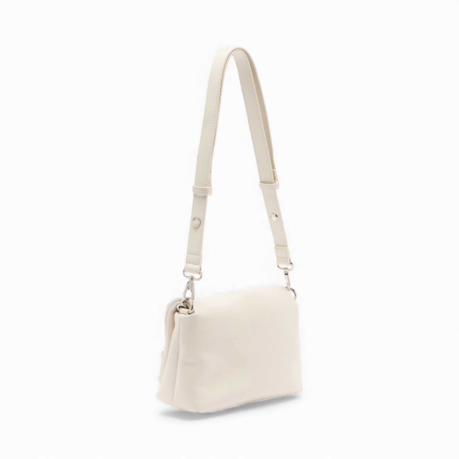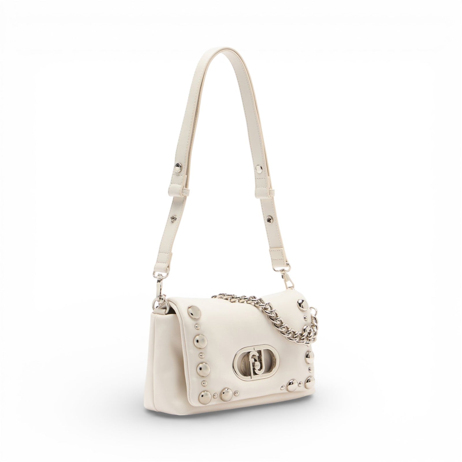 Borsa a tracolla media. Manici intercambiabili. Logo in metallo. Perle applicate. Tasca di servizio chiusa con zip. Chiusura con bottone magnetico.