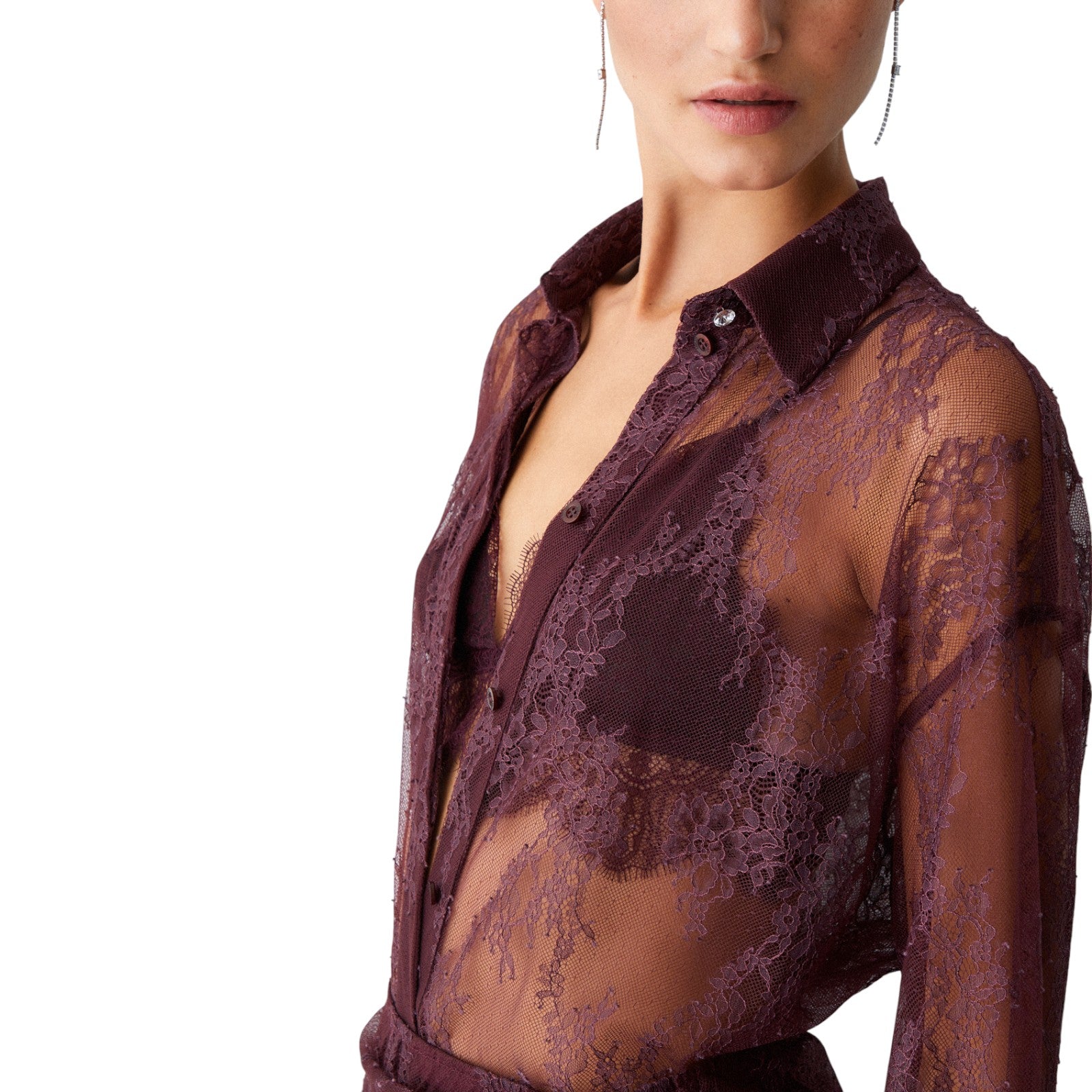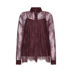 Camicia in pizzo chantilly. Top in abbinamento. Chiusura con bottoni in tono colore.