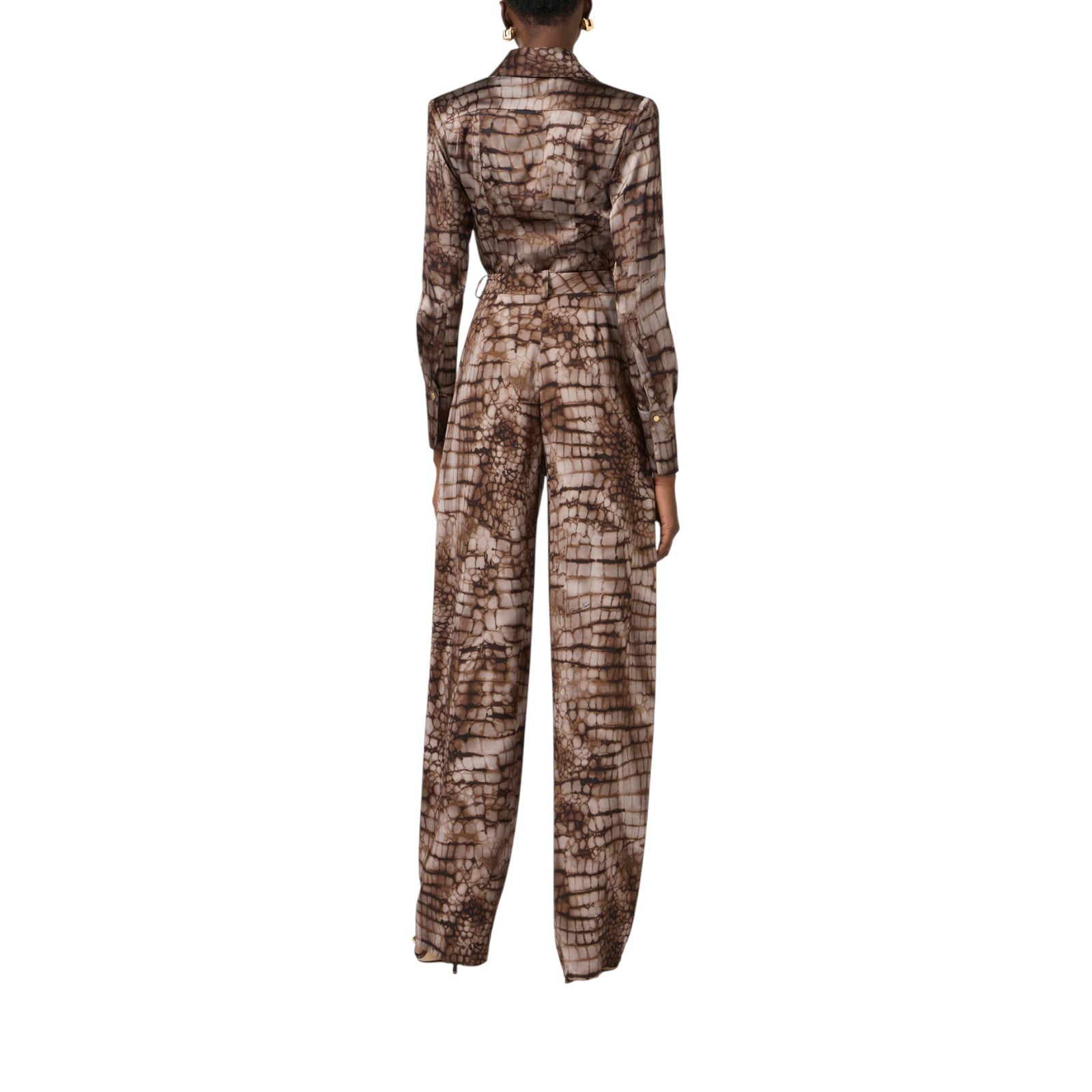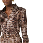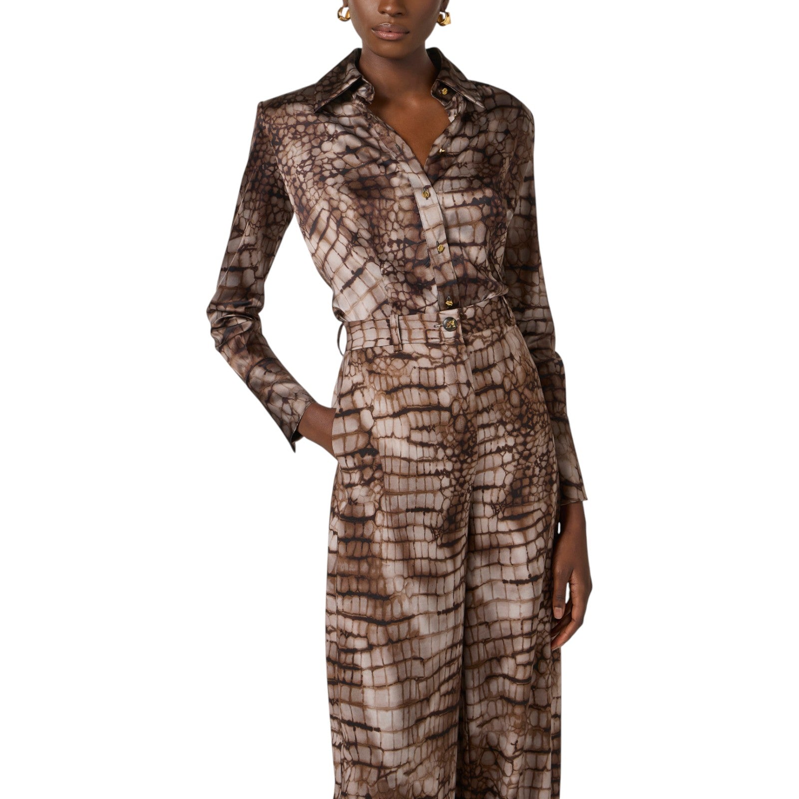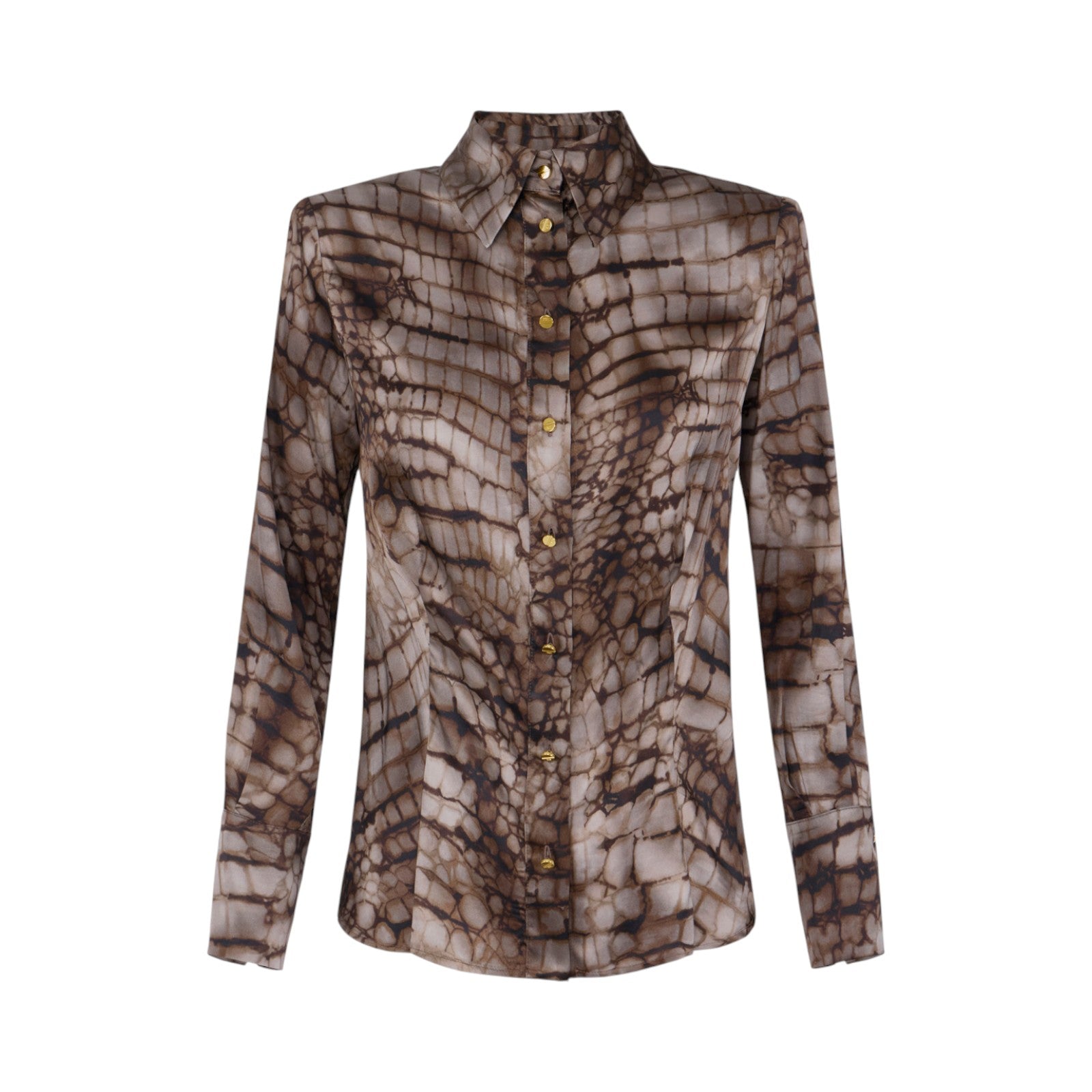 Camicia in raso con spalle strutturate a regalare una silhouette definita. Il capo ha colletto e maniche lunghe con polsini. Protagonista è la stampa all-over a tema alligatore, ispirata a forme e geometrie naturali. Vestibilità slim.