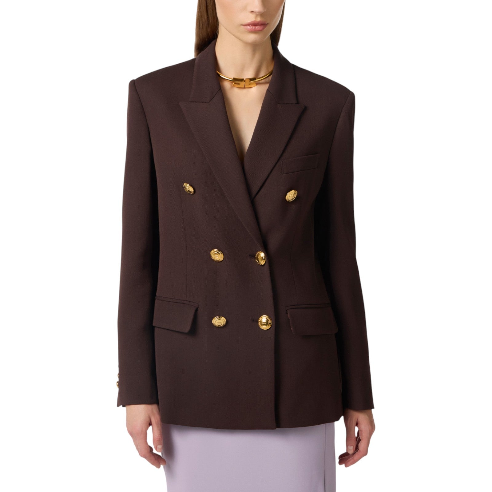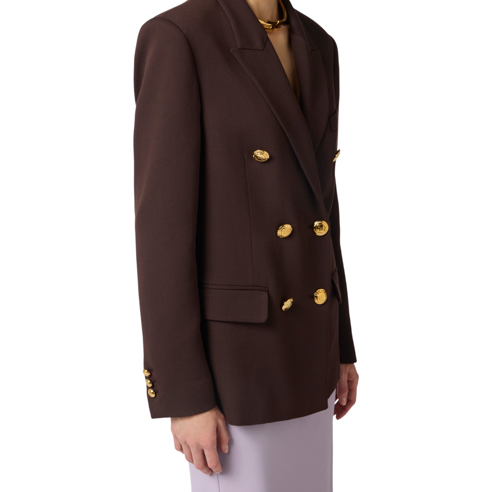 Giacca doppiopetto in gabardina. Il blazer ha spalle strutturate, rever a lancia, patte applicate. I bottoni in metallo dorato regalano eleganti note luminose. Vestibilità over.