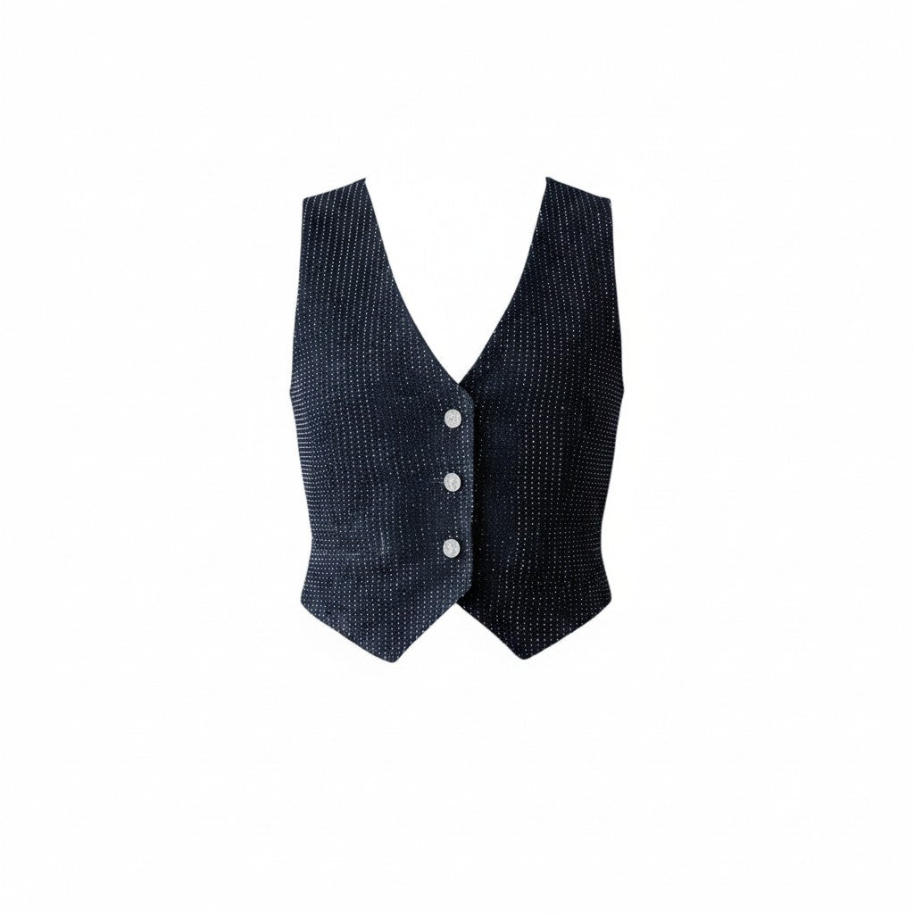 Gilet in denim full-strass. Scollo a V. Tasche a filetto. Chiusura con bottoni.
