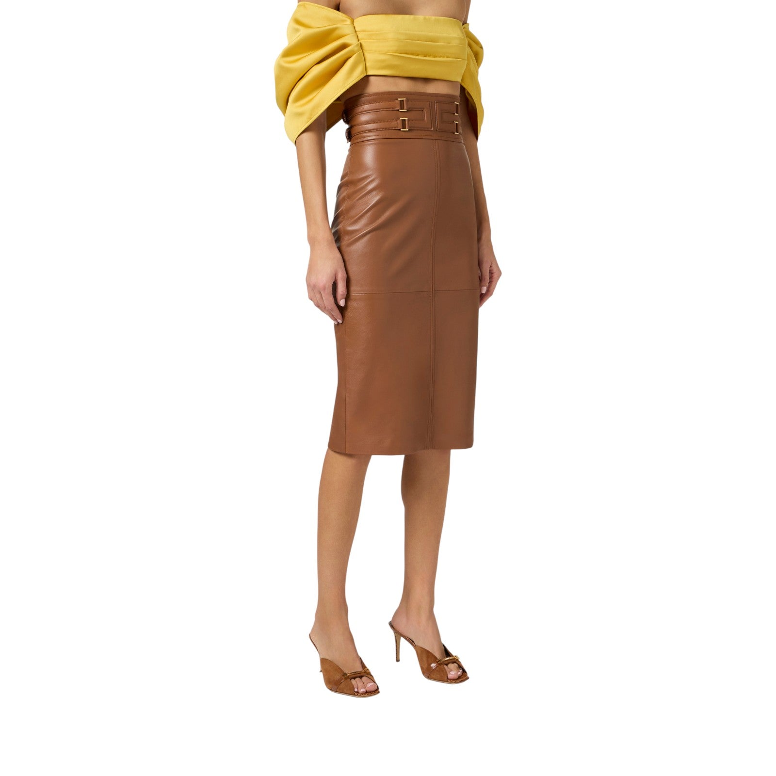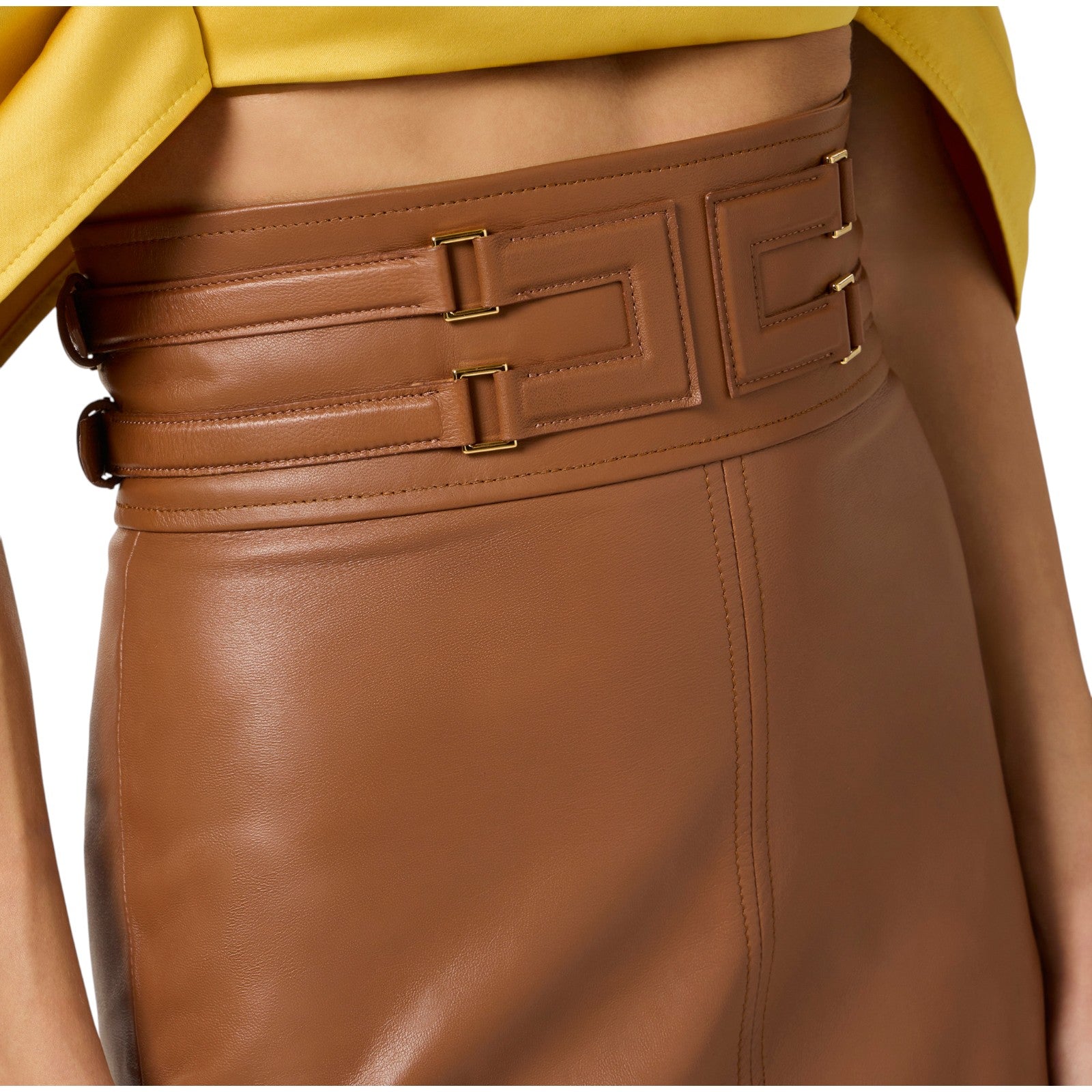 Gonna midi in pelle. Ha fascione alto in vita con logo embossed ottenuto con tecnica a rilievo e incorniciato da cinturini. Le anelle in metallo dorato aggiungono luminosità. Definita da tagli e impunture, ha spacco sul retro. Vestibilità aderente.