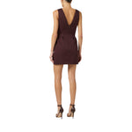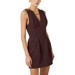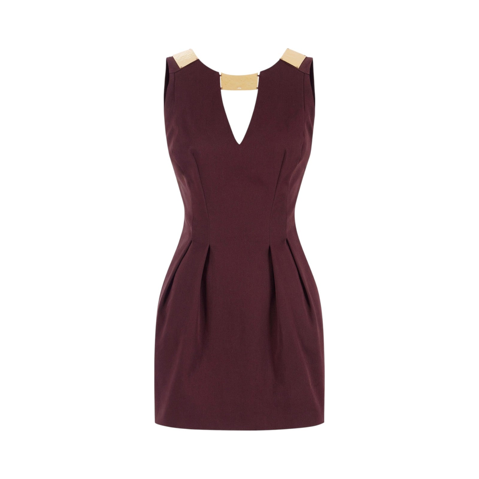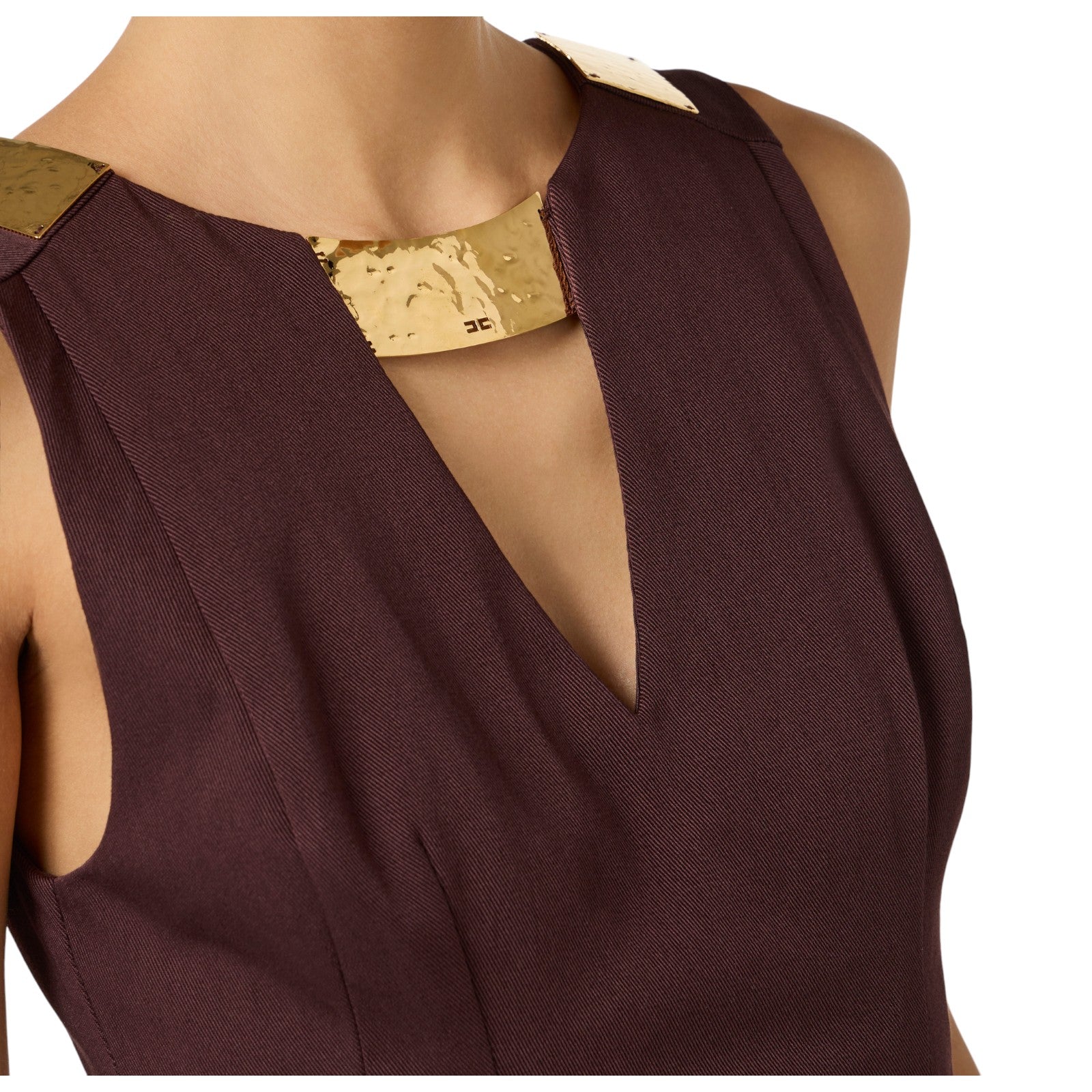 Mini abito in gabardina di cotone dalla vestibilità regular. Il vestito è smanicato e si distingue per lo scollo con placca in metallo dorato, martellata per evocare forme e texture naturali. Volumi bilanciati con la gonna ad anfora costruita a pieghe.