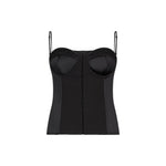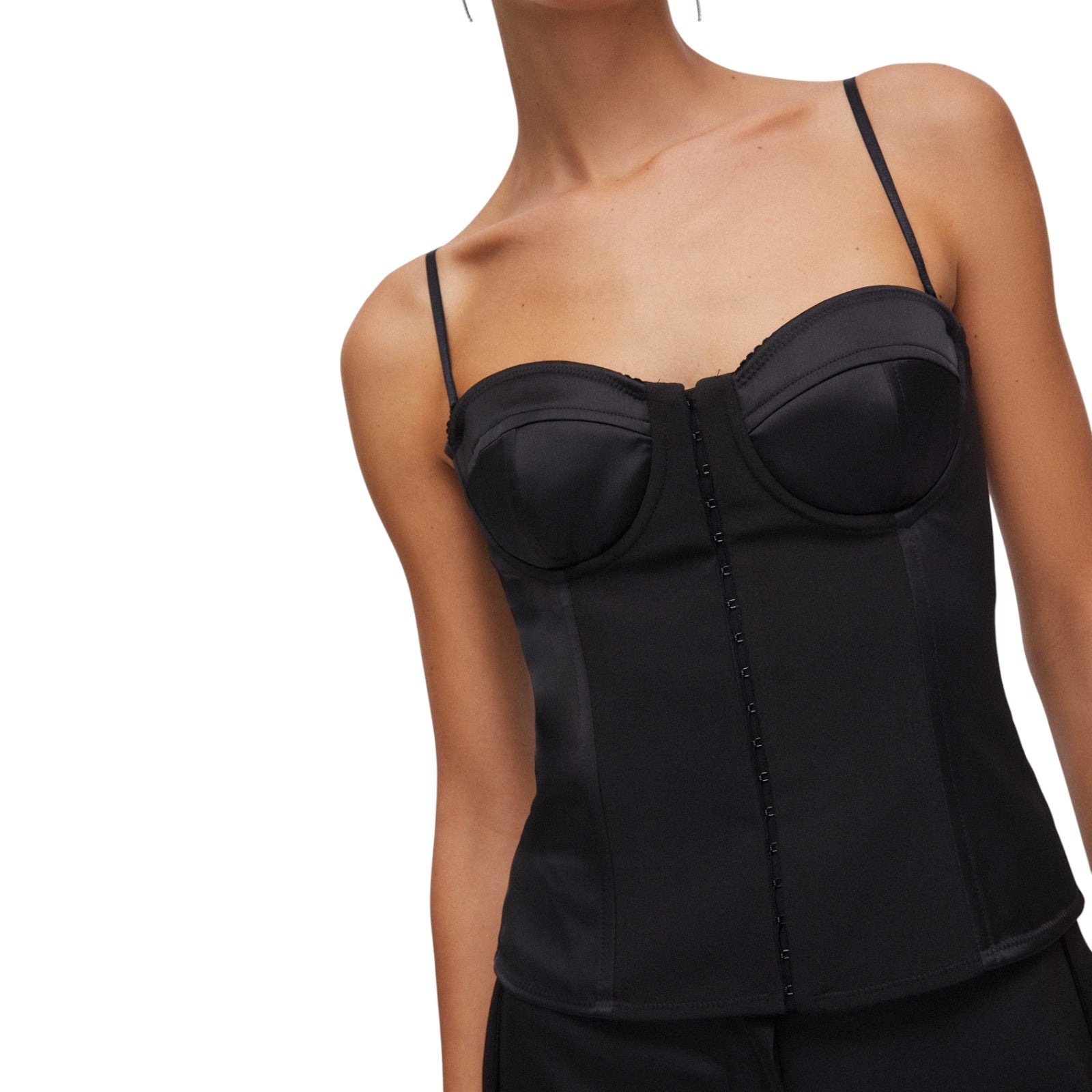 Top lingerie nero con taglio bustier. Realizzato in raso. Sorretto da spalline sottili e regolabili. Chiusura con gancetti nascosti sul davanti.