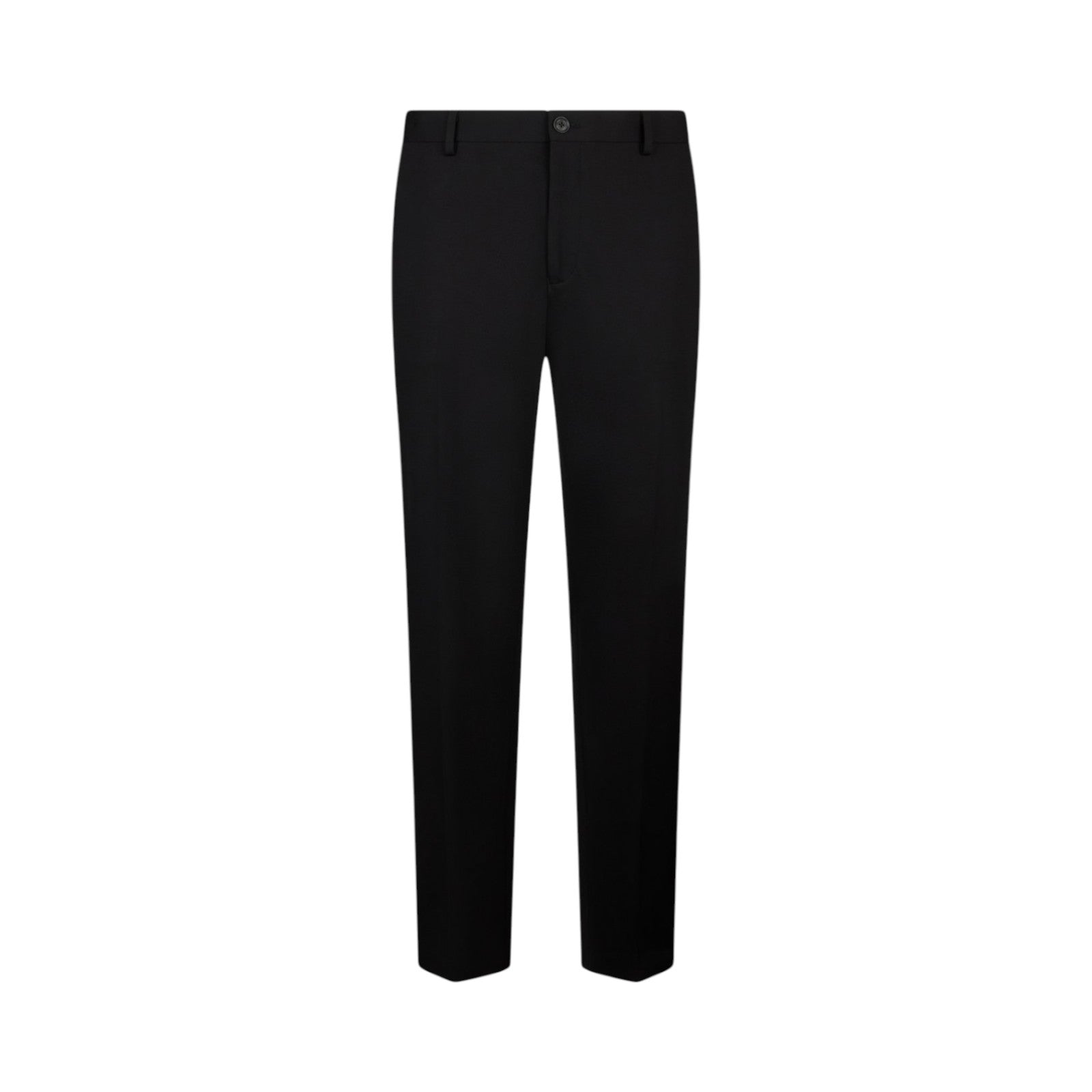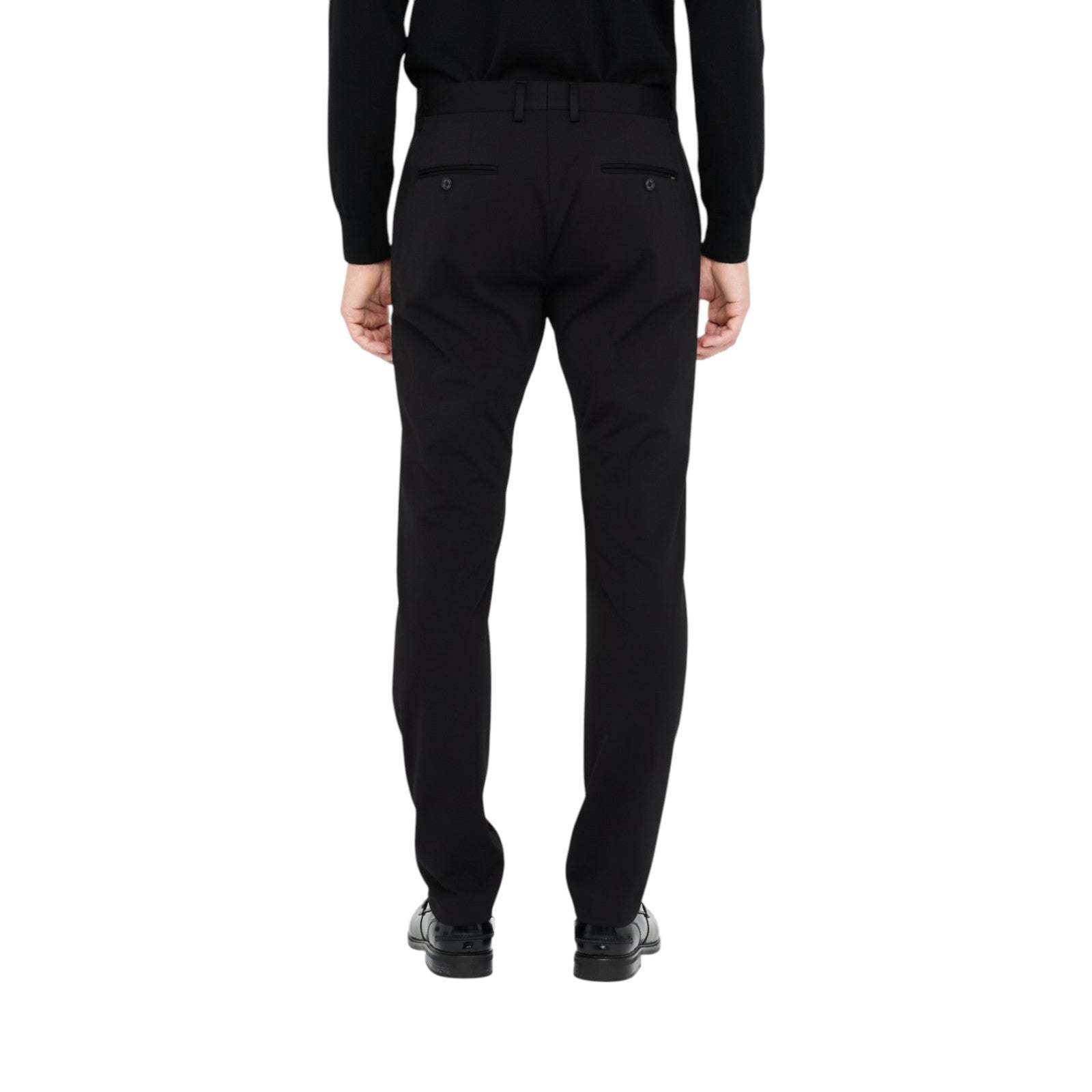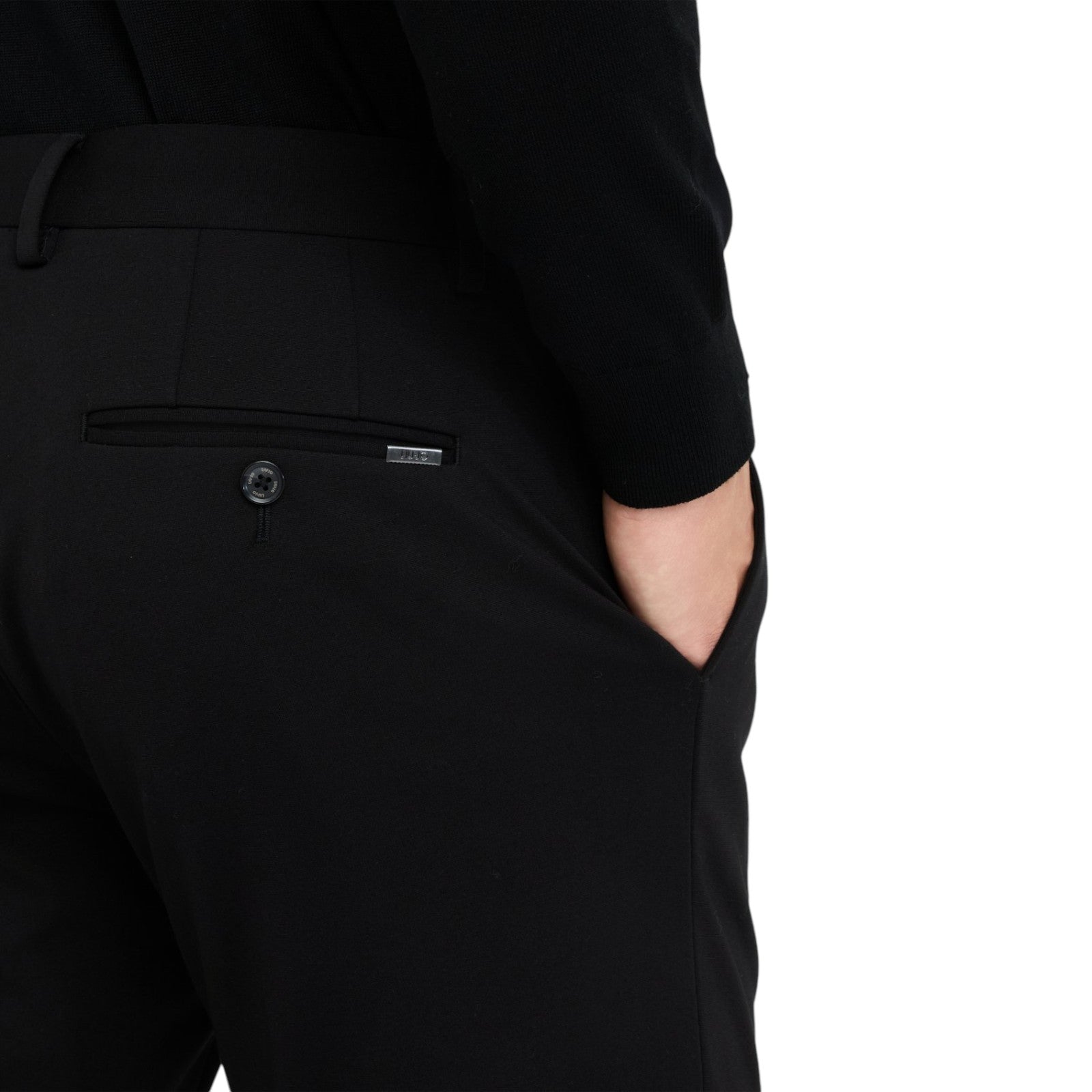 Pantaloni chino neri in jersey di viscosa. Vita media. Comode tasche. Gamba slim. Tasche a filetto sul dietro.