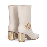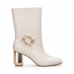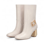 Stivaletti in nappa. Accessorio chain con logo. Tacco largo dalla linea scultorea. Altezza tacco: 7,5 cm. Altezza gambale: 20 cm. Larghezza gambale: 14,5 cm.