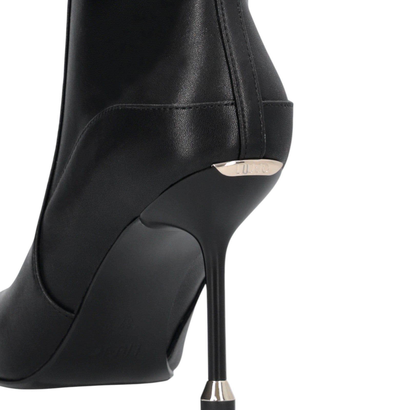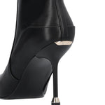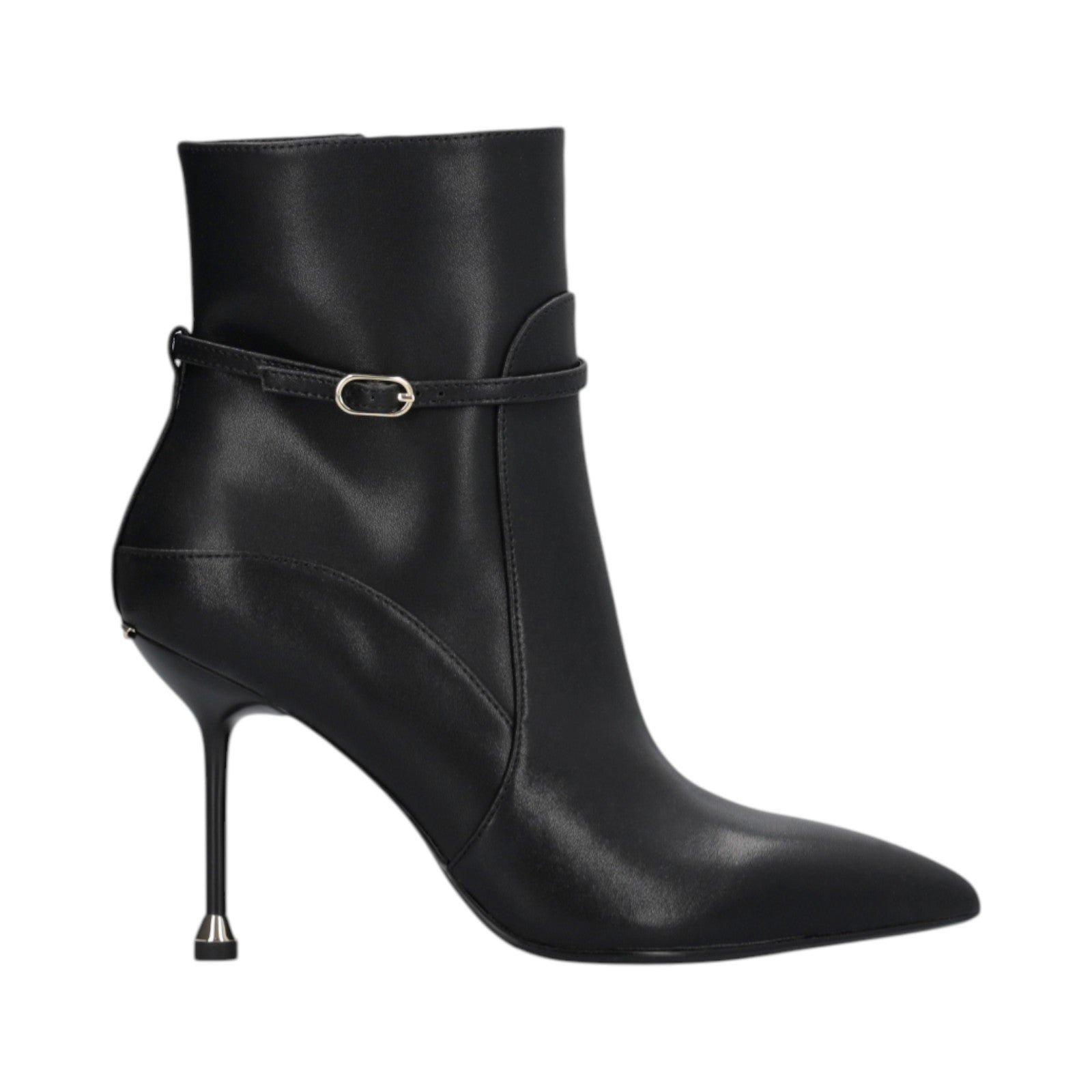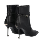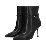 Stivaletti con tomaia in pelle. Fibbia decorativa. Punta affusolata. Chiusura con zip interna. Tacco a spillo. Dettaglio metallizzato sul fondo che offre maggiore comfort ad ogni passo. Accessorio logato sul tacco. Altezza tacco: 9,5 cm. Altezza gambale: 14 cm.