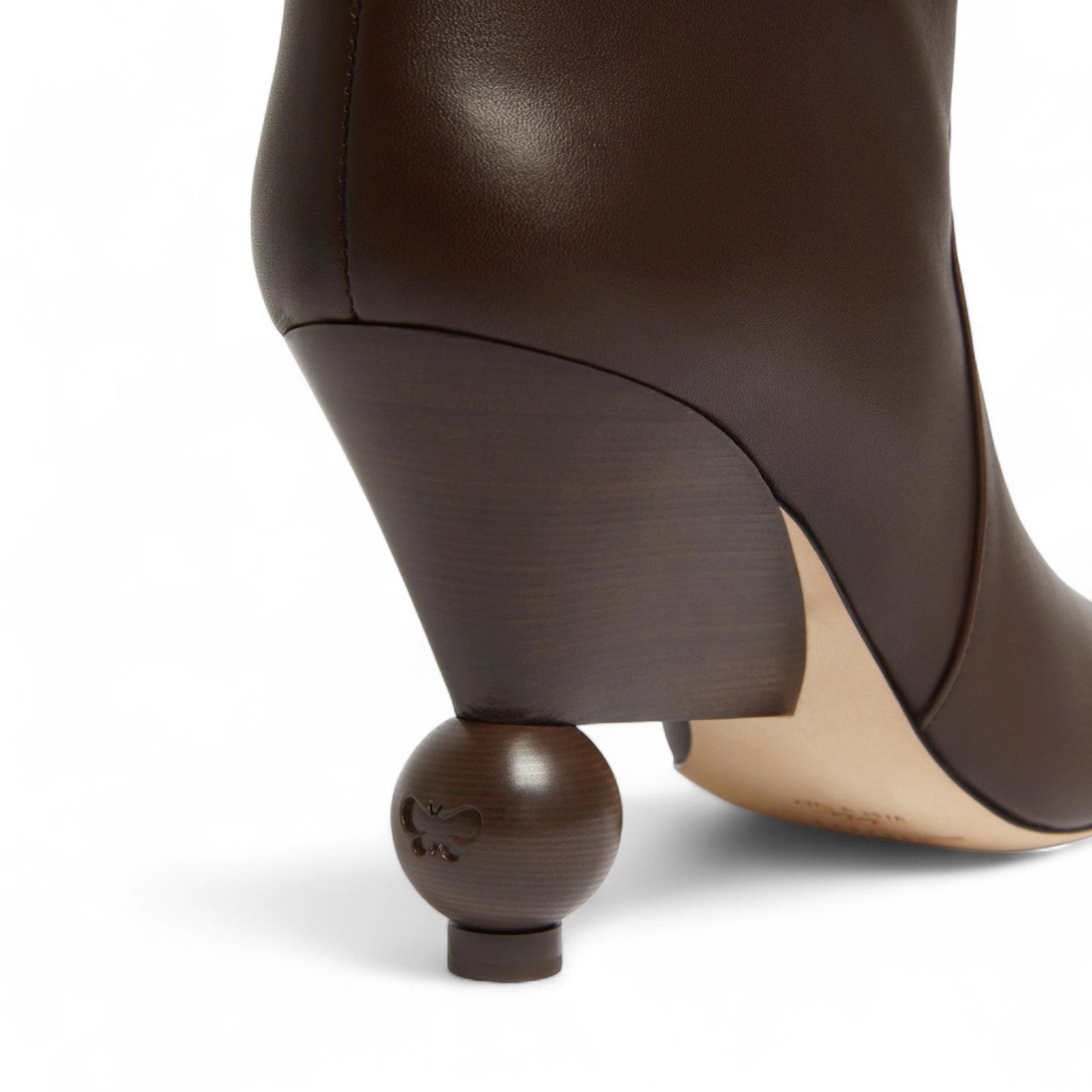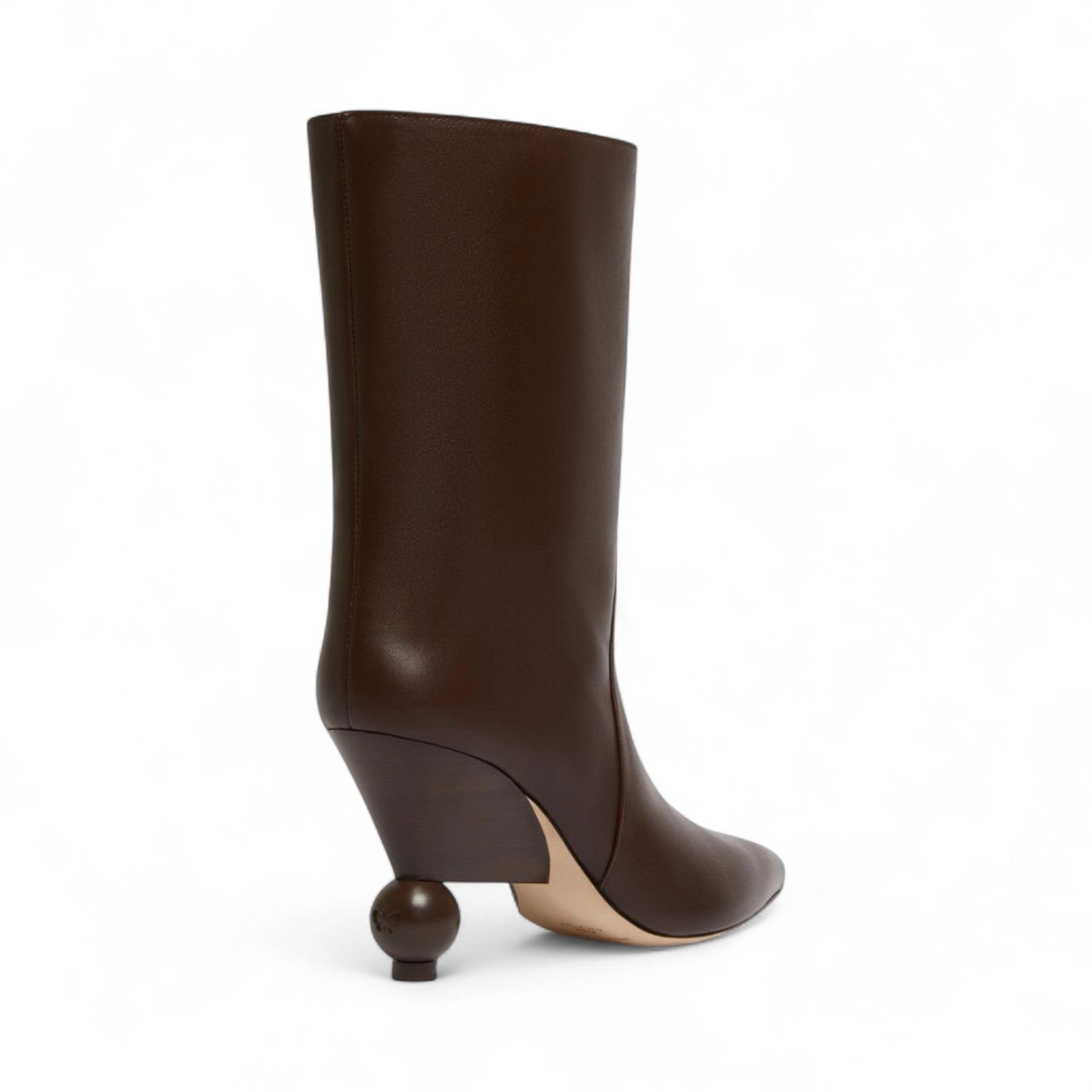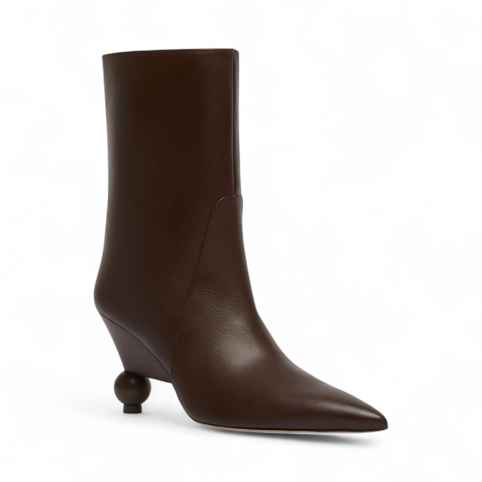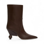 Stivaletto in pelle di vitello. Finitura lucida con mano morbida. Fodera in morbida nappa di agnello. Tacco zeppa, tagliato lateralmente, boule e sottotacco. Chiusura con zip laterale interna. Suola in cuoio pomiciato in tonalità naturale.