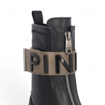 Stivali alla caviglia in pelle con suola carrarmato platform in gomma, fodera in pelle, chiusura con zip sul davanti e tirante posteriore per facilitare la calzata. Il tocco finale è dato dalla fascia in nastro tecnico con logo lettering PINKO.