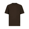 T-shirt marrone. Realizzata in cotone stretch. Lavorazione a righe. Taglio girocollo. Maniche corte. Logo in metallo al fondo.