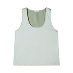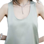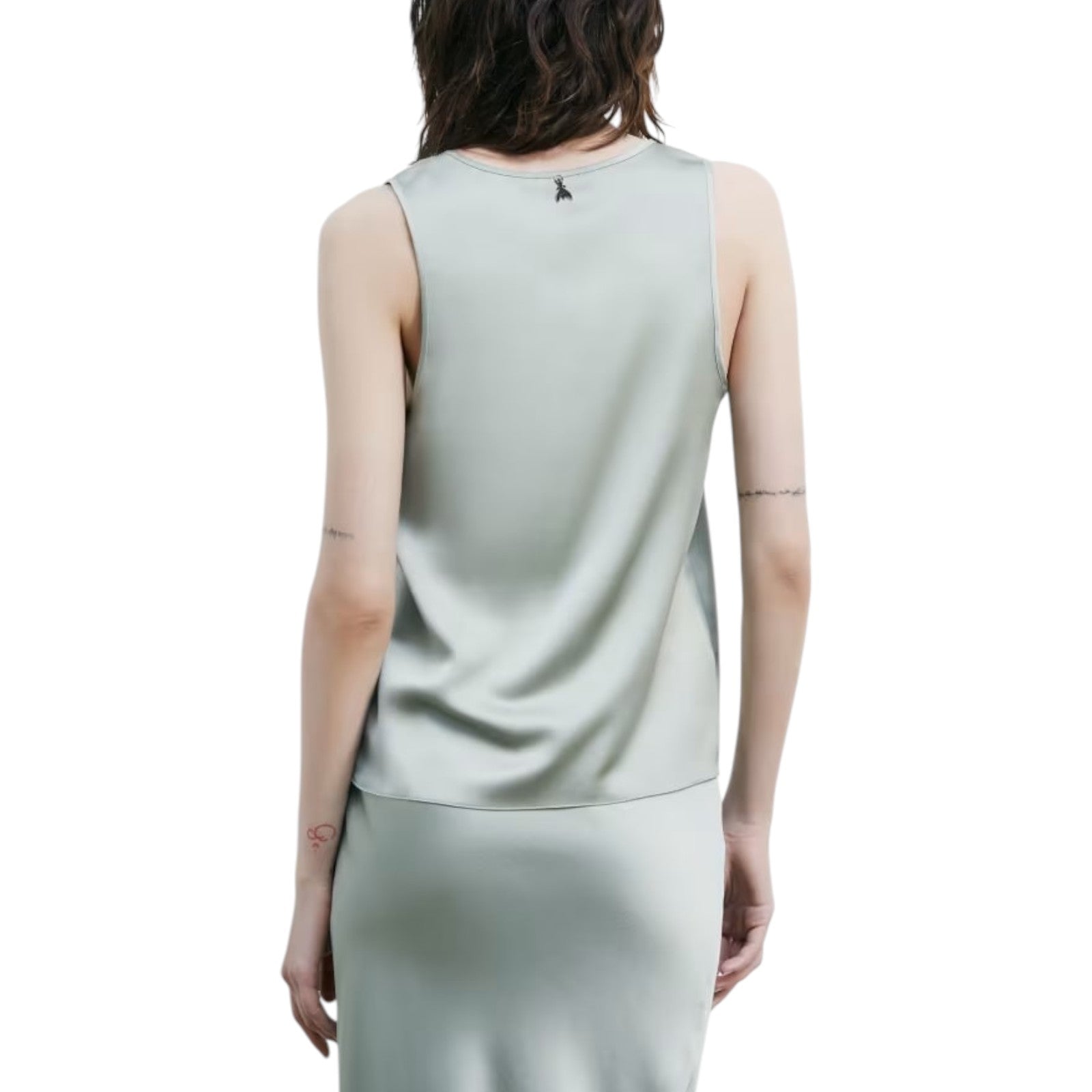 Raso lucido fluido. Vestibilità morbida. Senza maniche. Scollo rotondo. Dettaglio Fly sul retro.