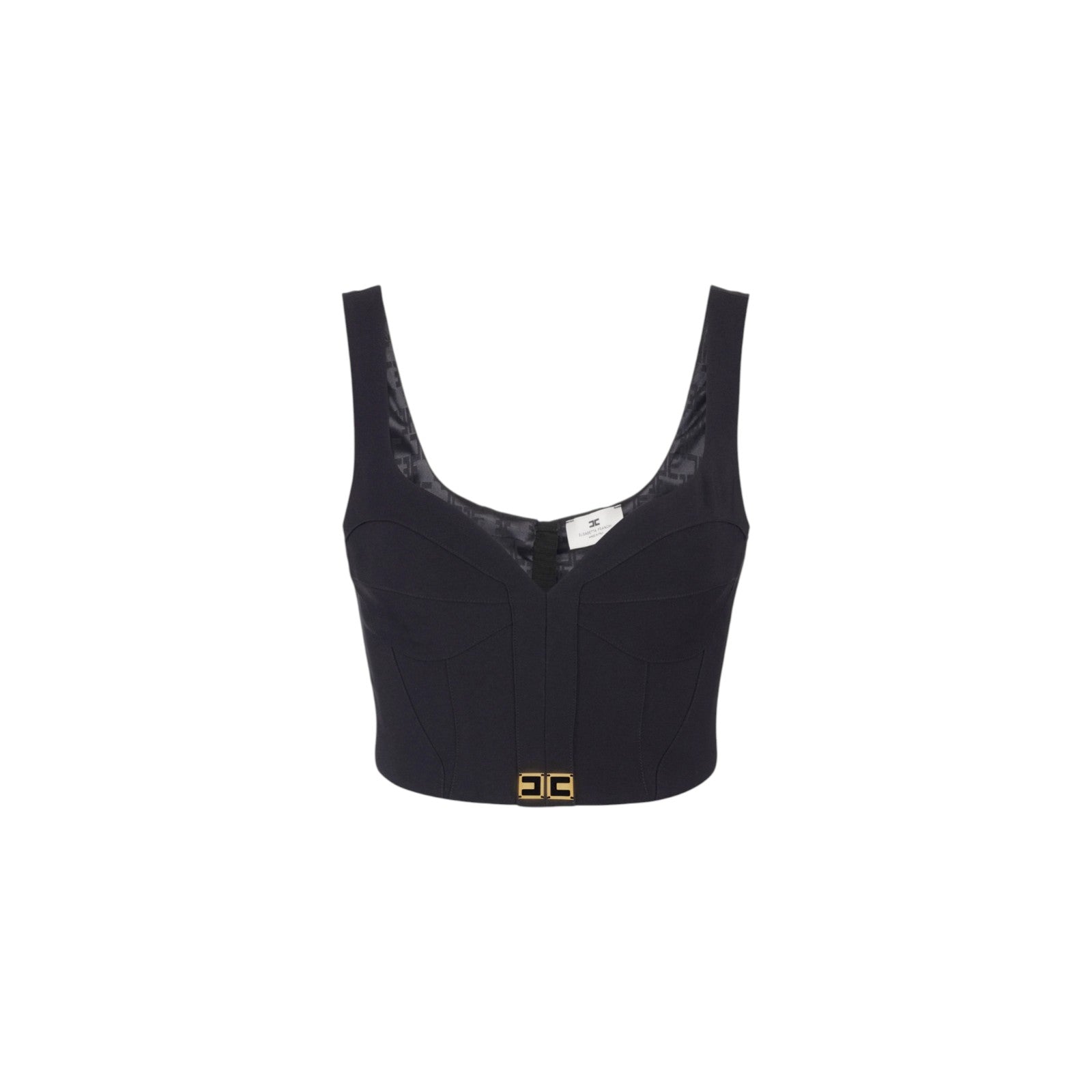 Top in crêpe leggero dalla vestibilità aderente. Con scollo a cuore, è definito dai tagli di ispirazione bustier che donano struttura a coppe e fianchi. Un doppio dettaglio con logo aggiunge una nota luminosa.