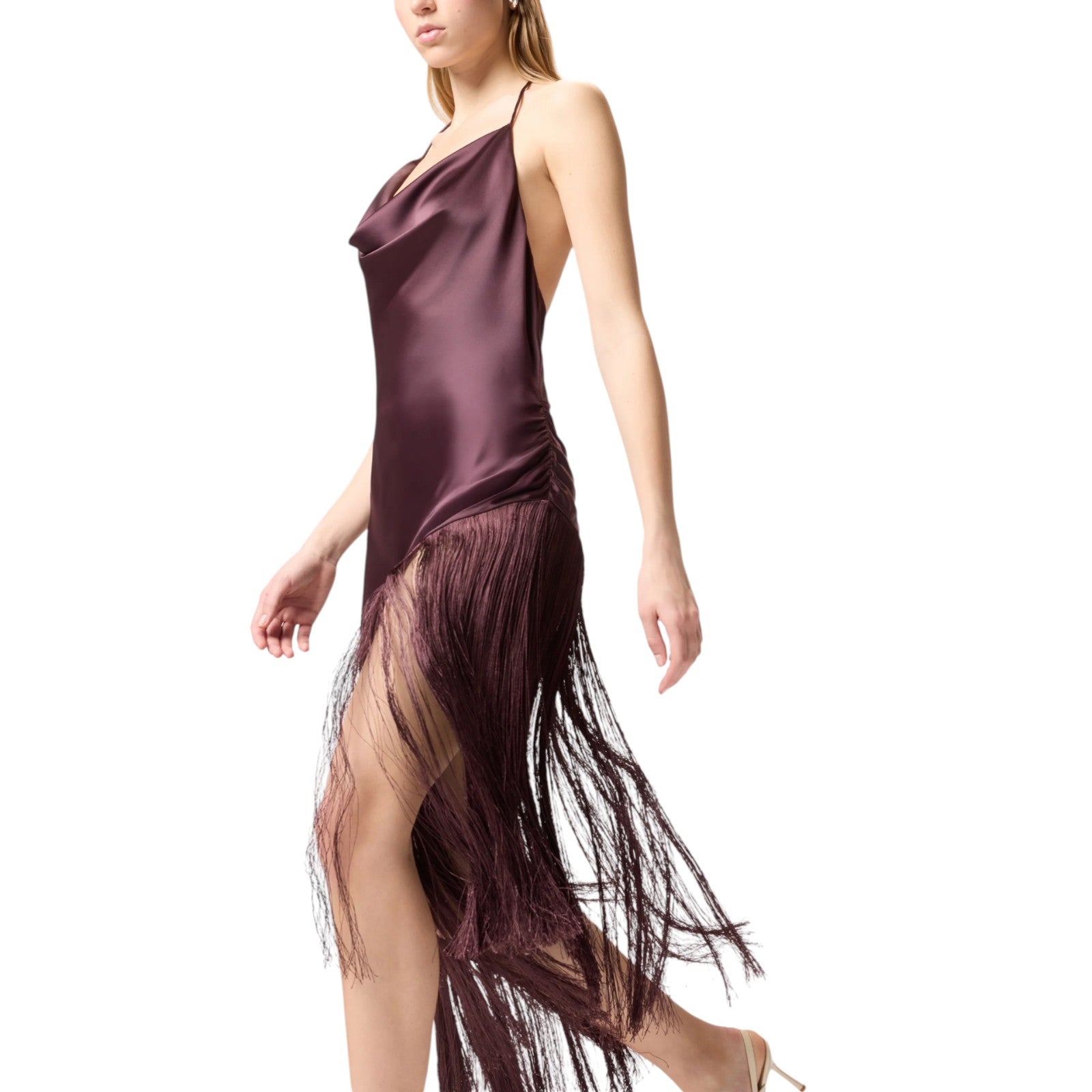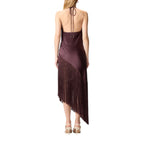 Abito senza maniche dalla silhouette aderente ma scivolata, realizzato in un lucente e setoso satin e caratterizzato da un particolare design lungo con orlo asimmetrico. Il capo presenta un morbido scollo drappeggiato con sottili nastrini da annodare dietro il collo e parte della schiena scoperta, ed è arricchito da lunghe e fitte frange sul fondo che ondeggeranno a ogni tuo passo.
