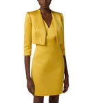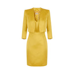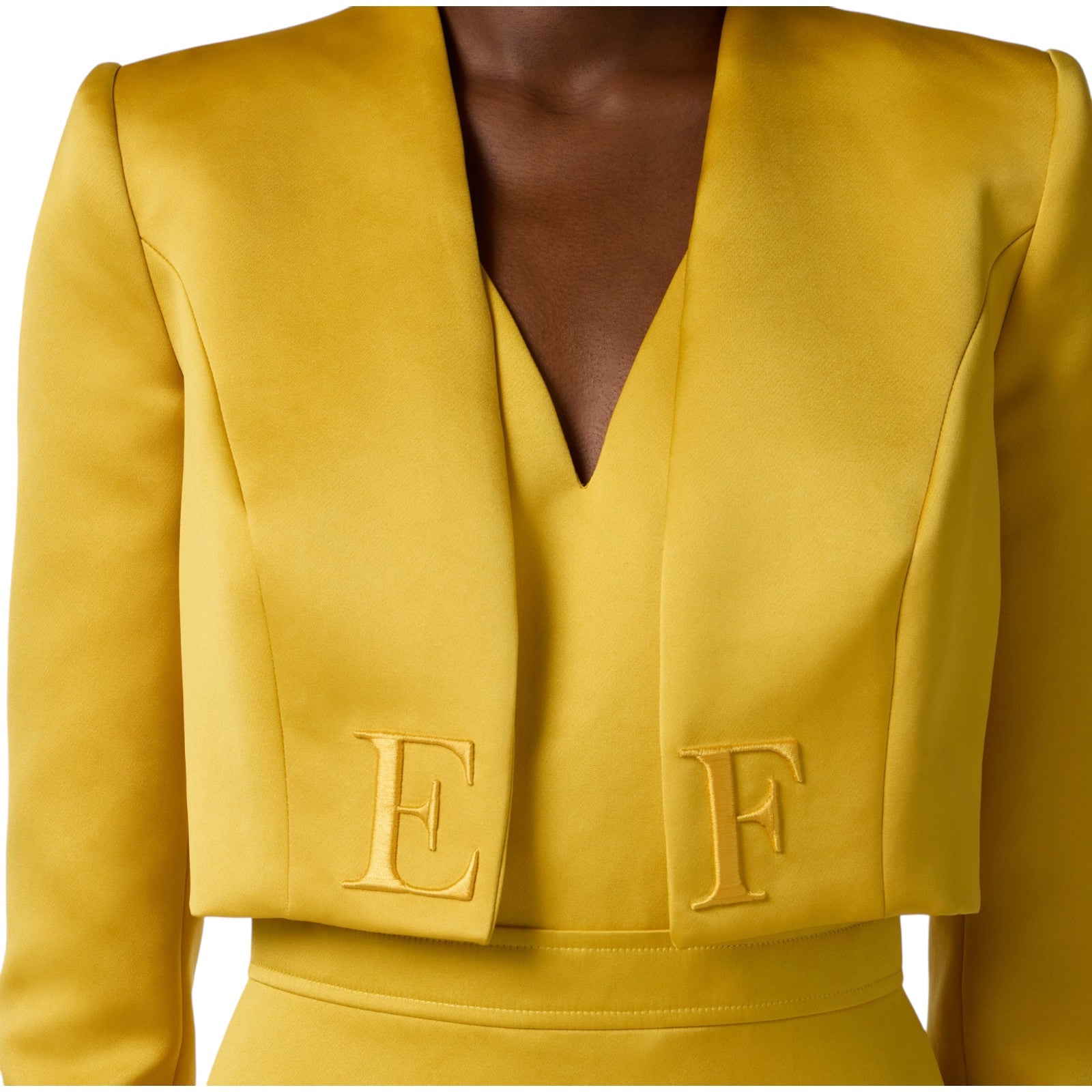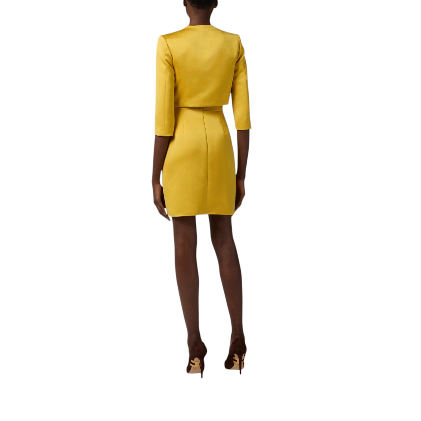Abito in duchesse. Il vestito è smanicato con scollo a V. Sorprende il retro in tulle che lascia intravvedere la schiena e crea raffinate trasparenze. La giacca abbinata ha spalle strutturate e tagli sagomati che disegnano la figura, al fondo dettagli con logo ricamati in filo e in tono. Vestibilità regular.