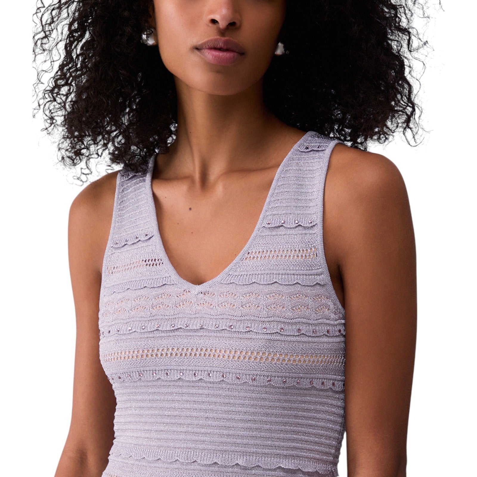 Abito lungo in maglia traforata Lavorazione punzonata. Interventi in lurex. Scollo a V. Volant sul fondo. Fodera corta.