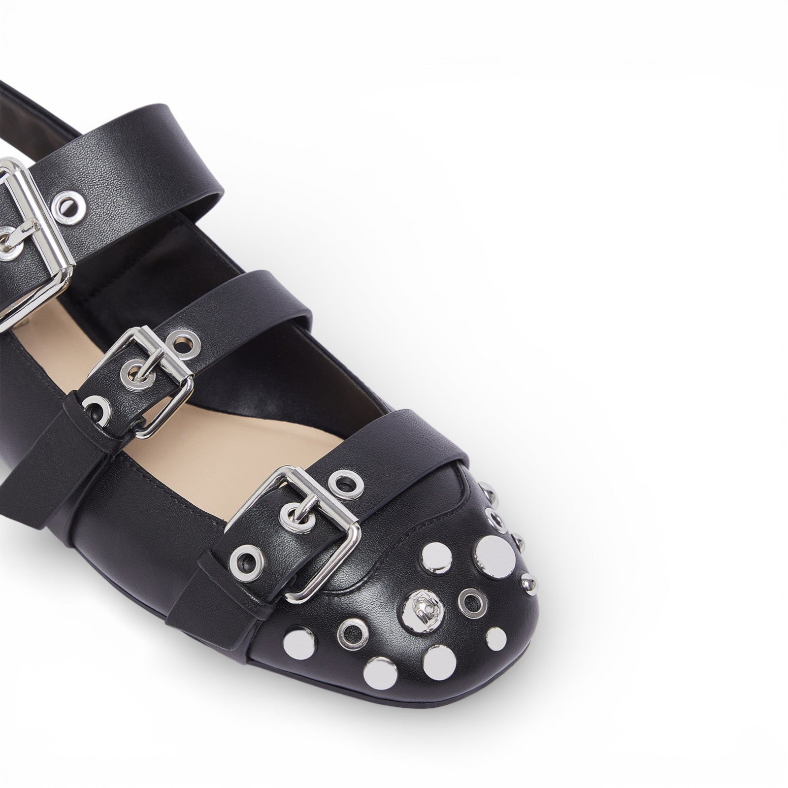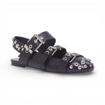 Ballerine slingback in pelle. Dettagli borchie e occhielli. Cinturini con fibbie regolabili. Suola flat.