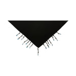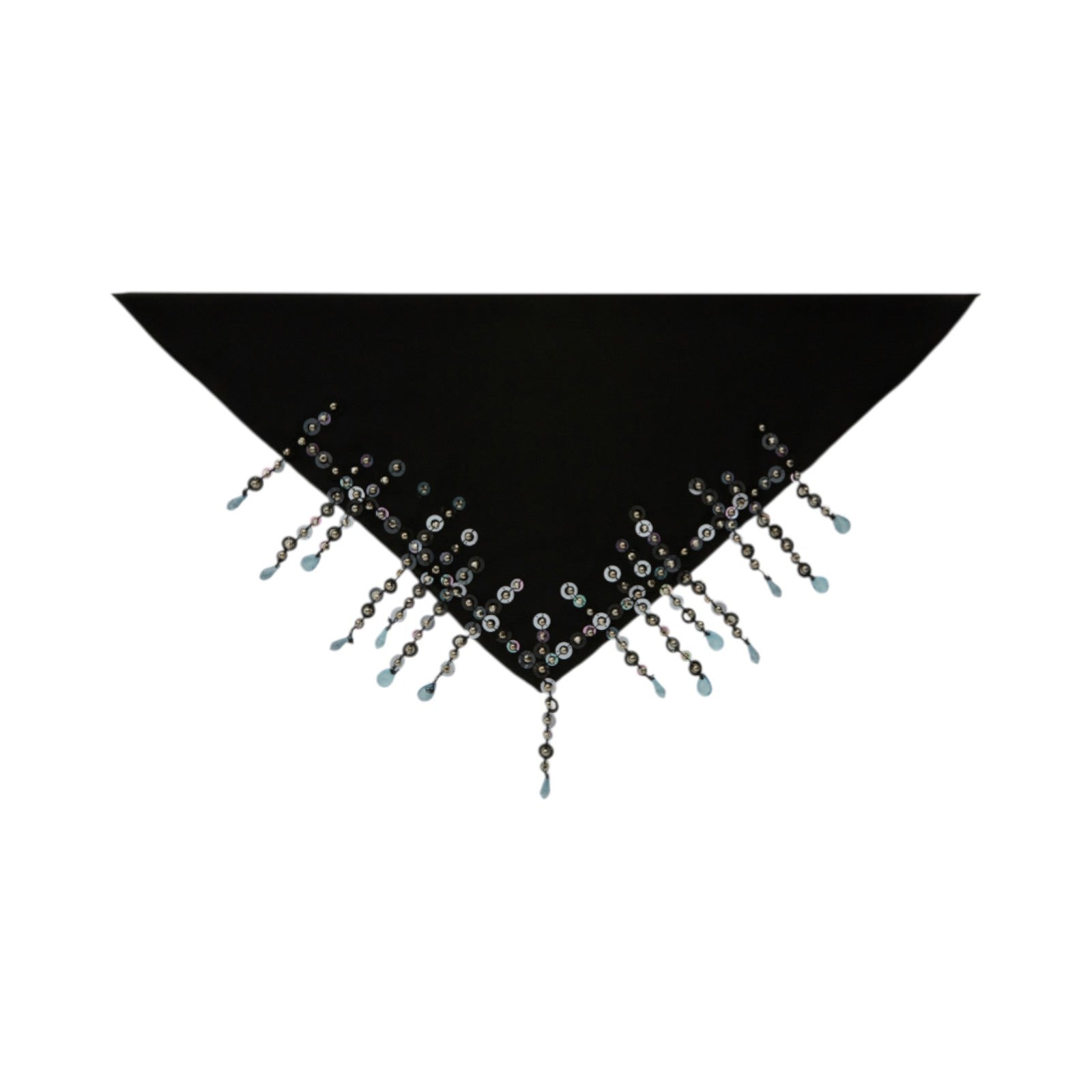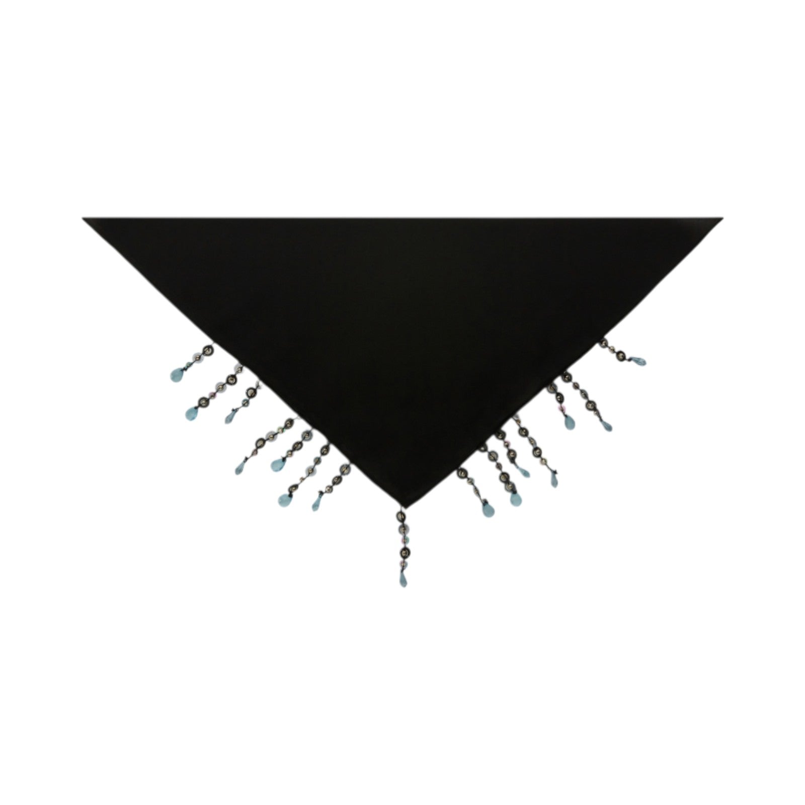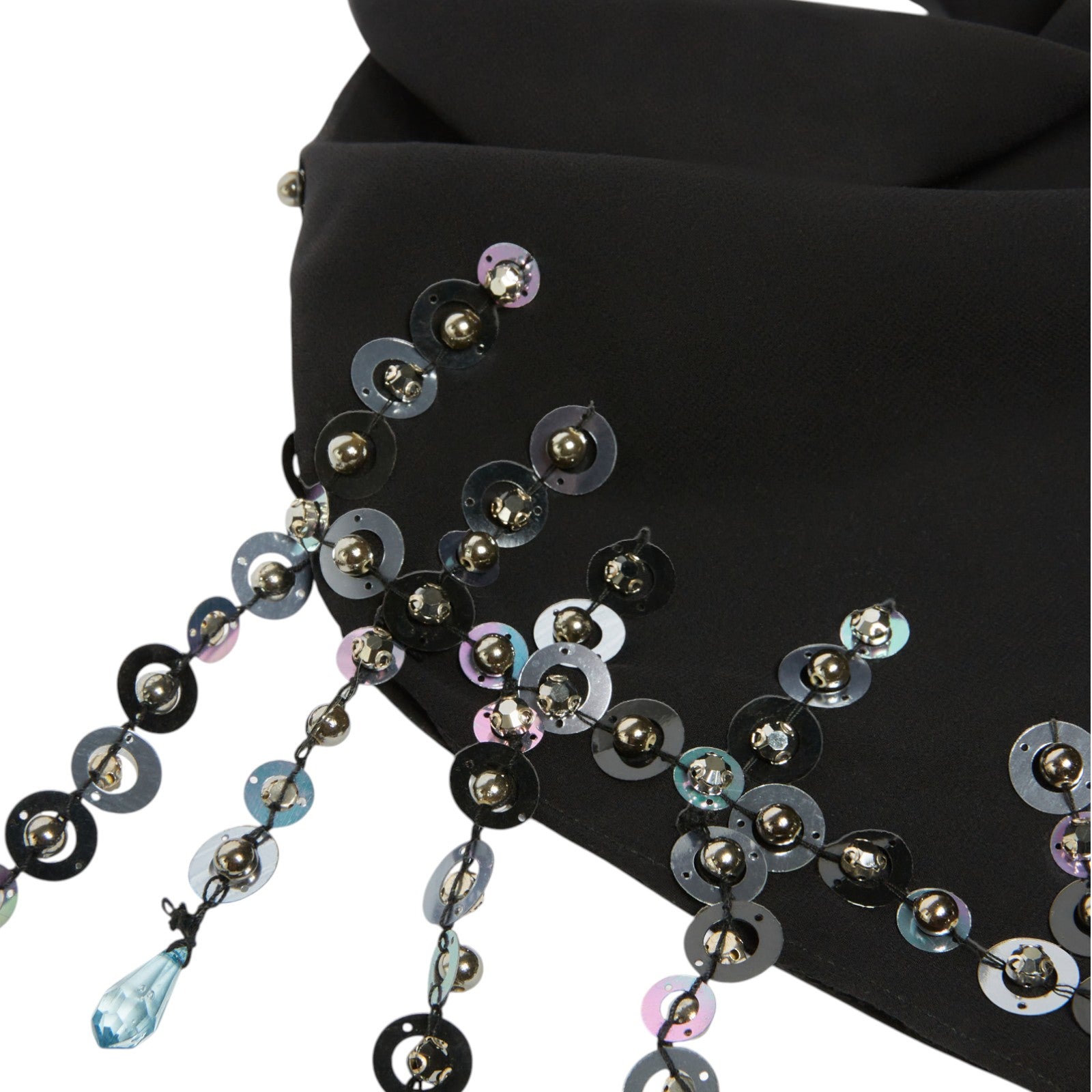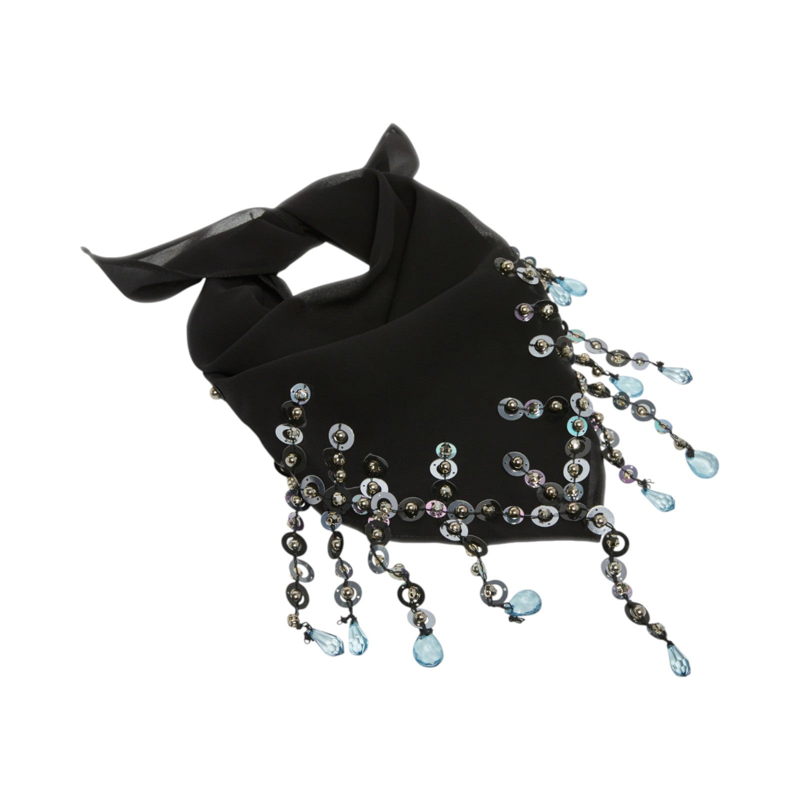 Bandana in leggero tessuto georgette impreziosita da un ricamo di paillettes rotonde con all'interno cristalli di vetro e piccole sfere metalliche che creano luminosi riflessi nei toni del nero e del blu. Paillettes disposte lungo il bordo di due lati.