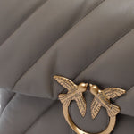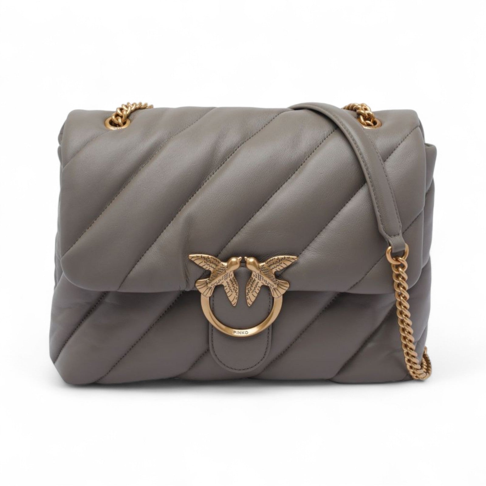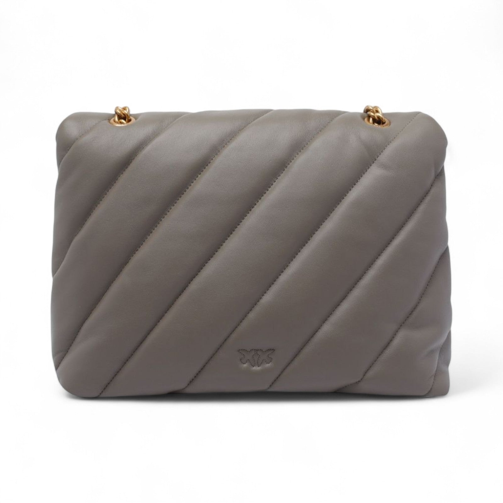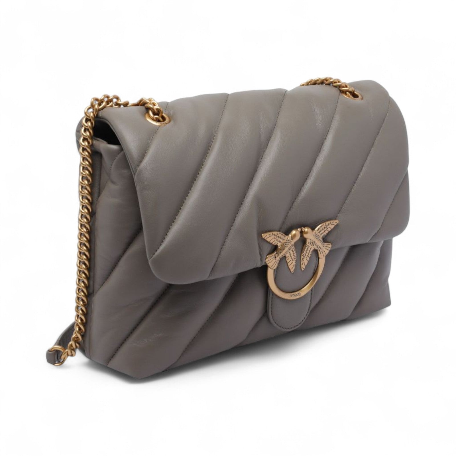 Big Love Bag Puff in morbida nappa con maxi trapuntatura obliqua. La chiusura è completata dall'iconica fibbia in metallo Love Birds Diamond Cut. L'interno è foderato in microfibra scamosciata e comprende tramezza chiusa con zip e tasca a parete. La tracolla combina la classica catena metallica rotonda al pratico spallaccio in nappa.