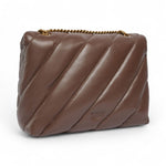 Big Love Bag Puff in morbida nappa con maxi trapuntatura obliqua. La chiusura è completata dall'iconica fibbia in metallo Love Birds Diamond Cut. L'interno è foderato in microfibra scamosciata e comprende tramezza chiusa con zip e tasca a parete. La tracolla combina la classica catena metallica rotonda al pratico spallaccio in nappa.