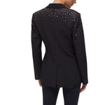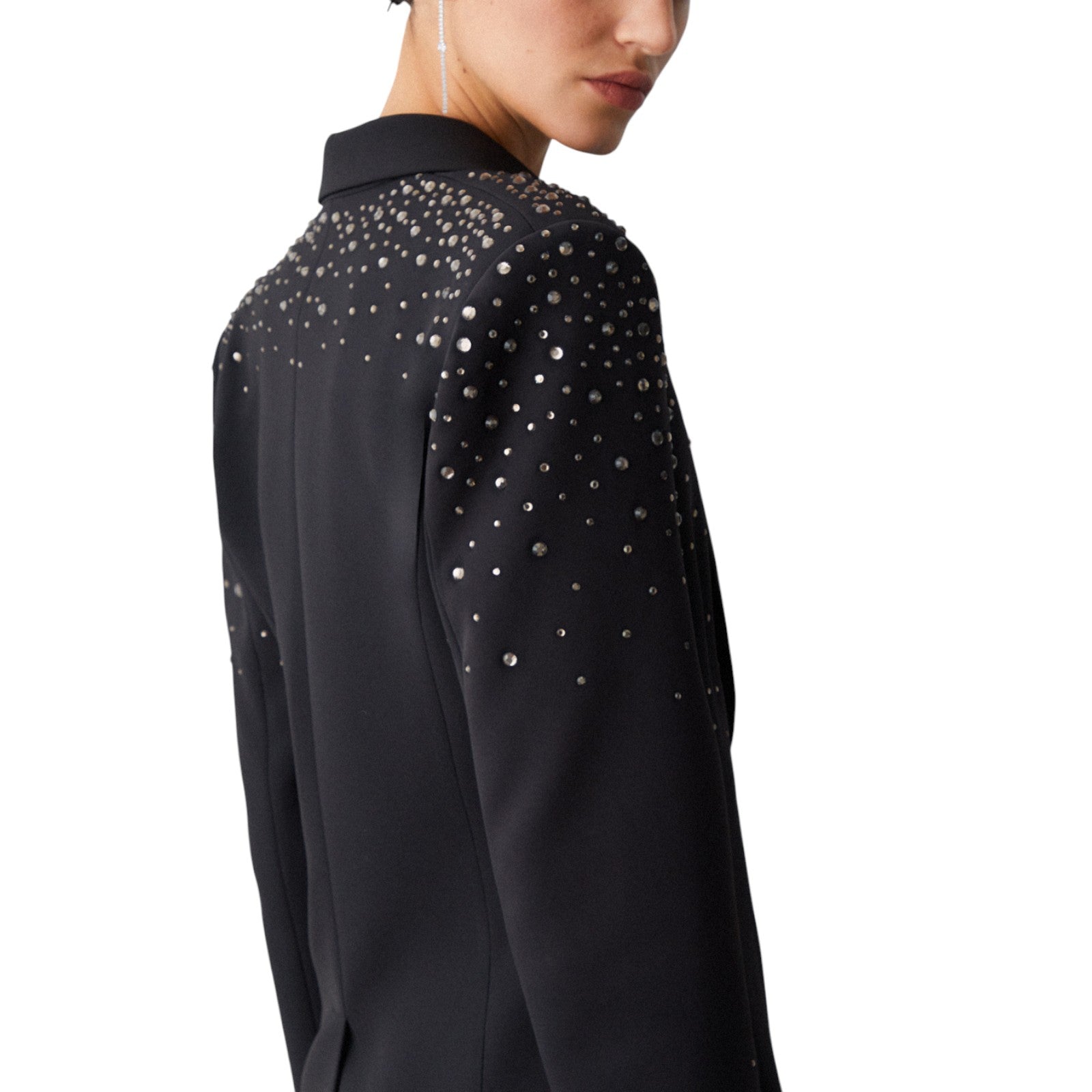 Blazer nero elegante in cadi stretch. Slim fit. Reve classico. Spacchetto dietro. Ricami gioiello. Chiusura con bottone rivestito.