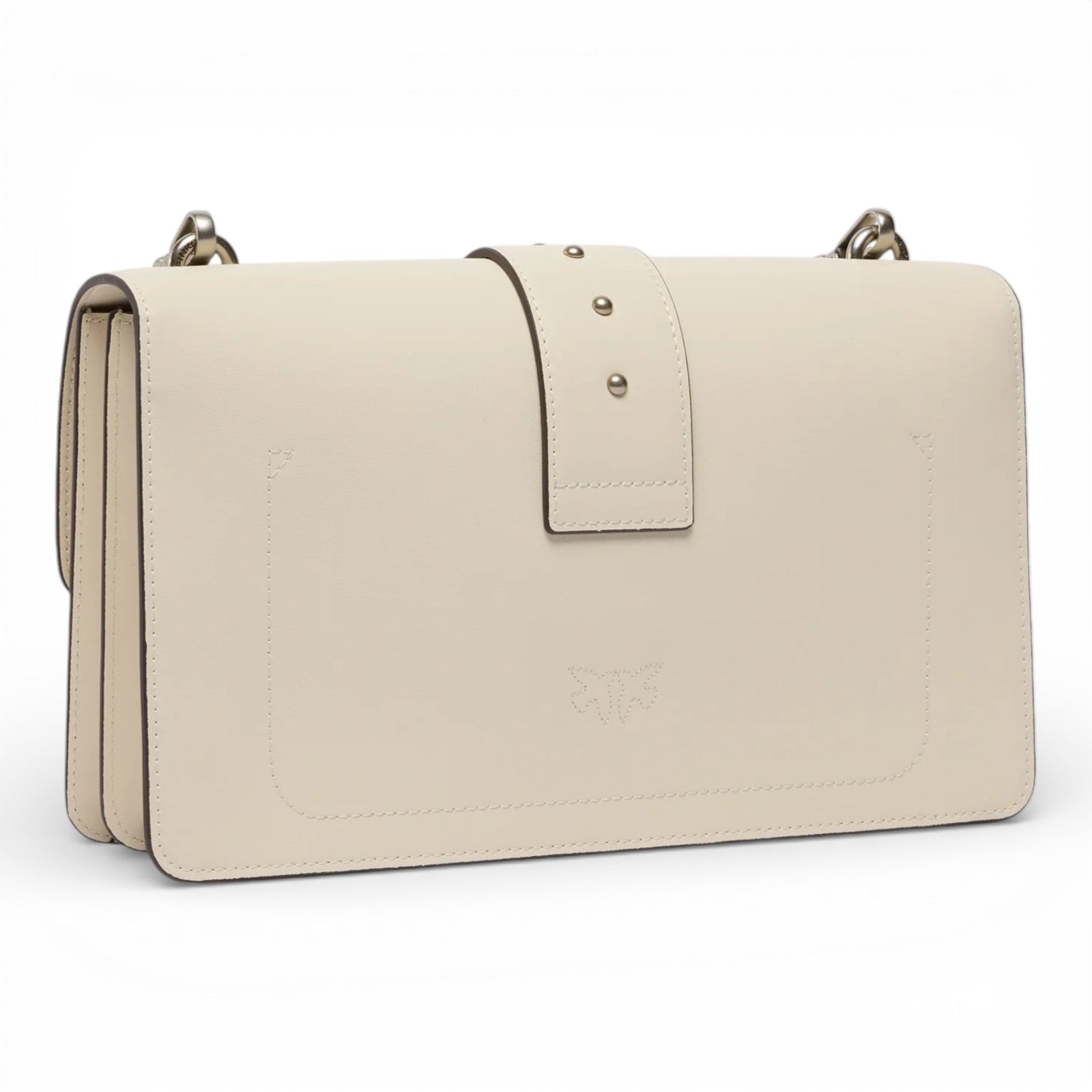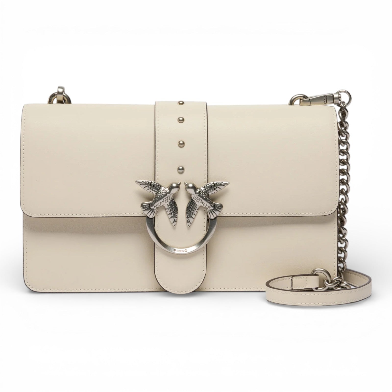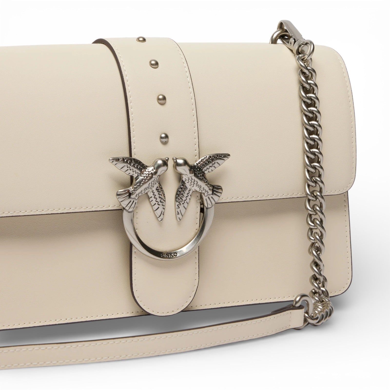Borsa a mano media Love Bag One realizzata in pelle dalla mano seta. Caratterizzato dalla tracolla regolabile e rimovibile in pelle e catena, il modello risulta estremamente versatile e pratico. La chiusura a baccello con bottone magnetico è completata da fibbia con logo uccellini Love Birds Diamond Cut e piccole borchie in metallo. L'interno è foderato in cotone e presenta una tasca con zip.