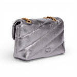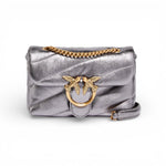 Borsa Baby Love Bag Puff di piccole dimensioni in morbida nappa laminata con maxi trapuntatura obliqua. Il modello include una tracolla a catena con filo tondo e spallaccio in pelle, che permette di ottenere tre diverse opzioni di portabilità: a mano, crossbody e a spalla. Contemporanea e raffinata, la borsetta è personalizzata inoltre dalla fibbia Love Birds Diamond Cut sulla chiusura a baccello, portavoce dell'inimitabile stile PINKO, ed è dotata di un interno foderato in drill di cotone con tasca a parete completa di zip ed etichetta logata.