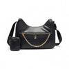 Borsa a spalla liscia. Fodera interna logata. Scomparto centrale chiuso con zip. Tasca frontale con zip. Catena gioiello. Portamonete in abbinamento.