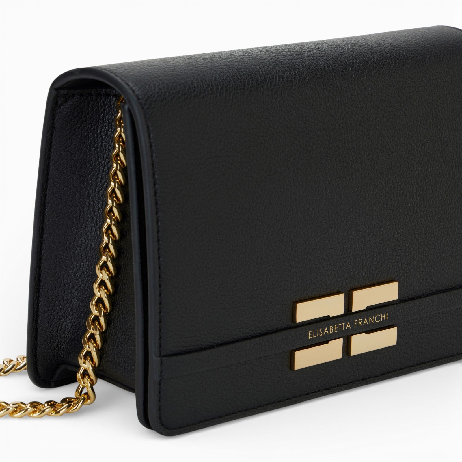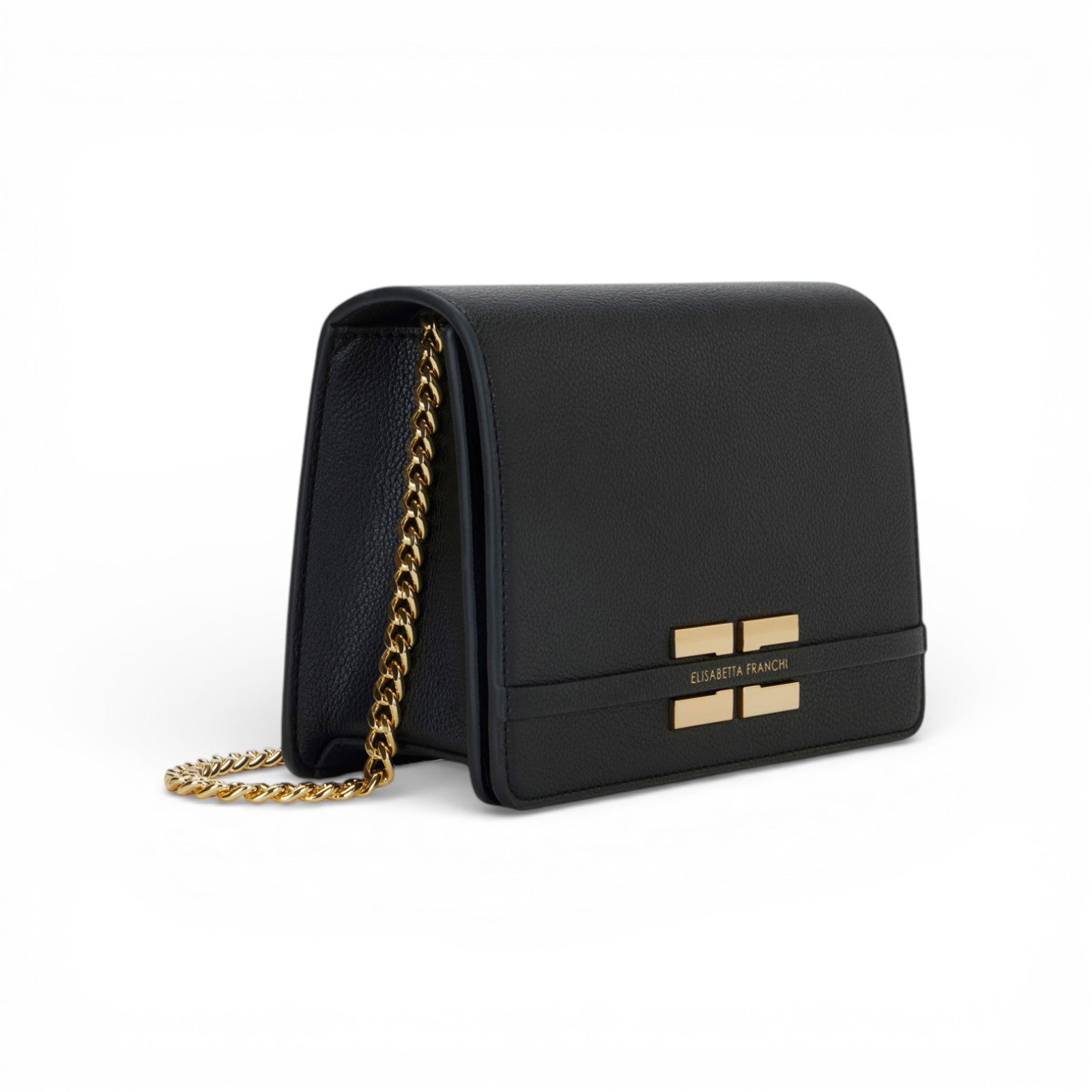 Borsa realizzata in materiale sintetico con texture effetto pelle. Con tracolla in catena groumette, ha shape compatta e lineare ed è impreziosita dalla placca con logo sul davanti.