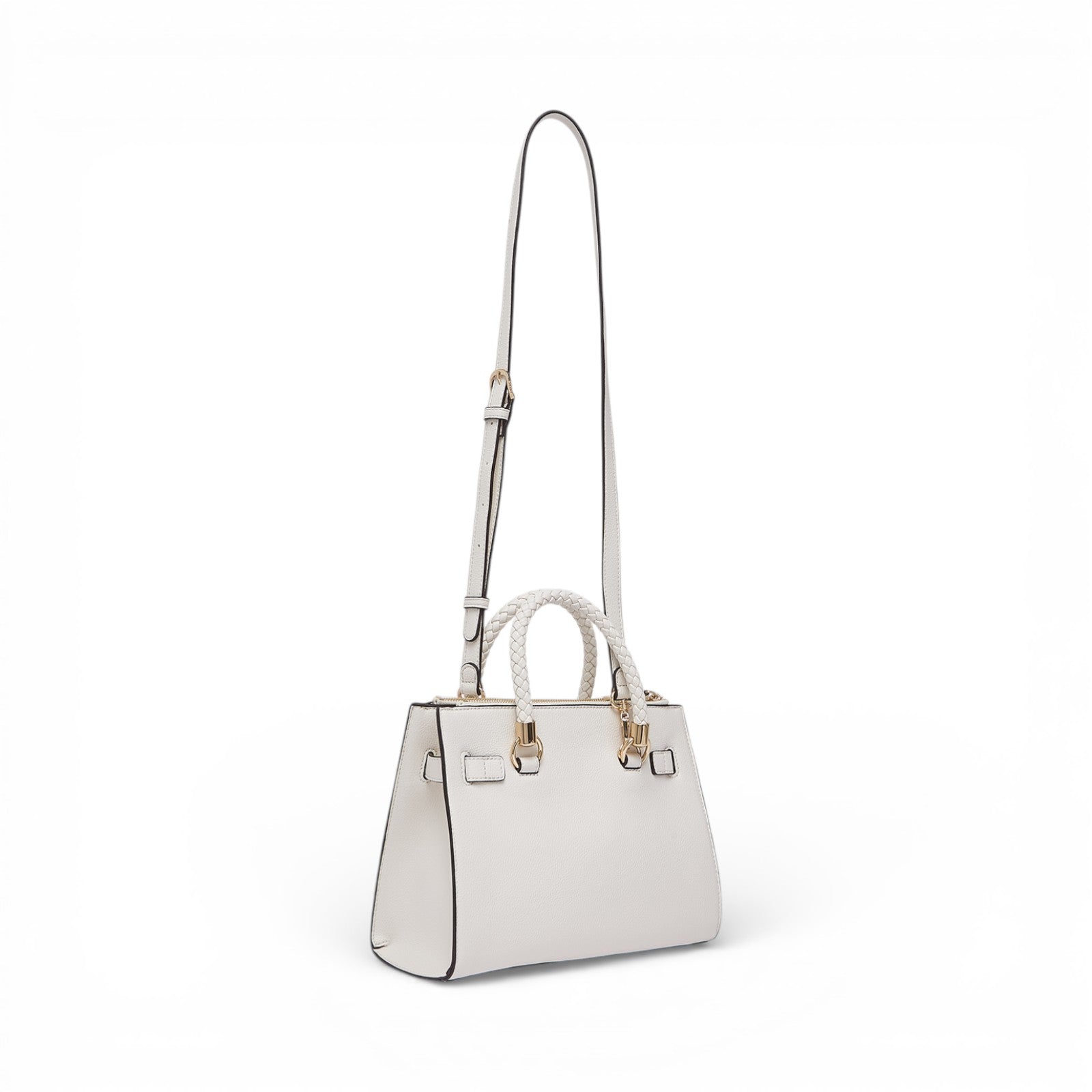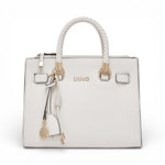 Borsa piccola color panna. Modello satchel. Effetto bottalato. Fodera interna logata. Due scoparti chiusi con zip. Scomparto centrale chiuso con bottone magnetico. Manici intrecciati. Charm in tono colore. Tracolla removibile.