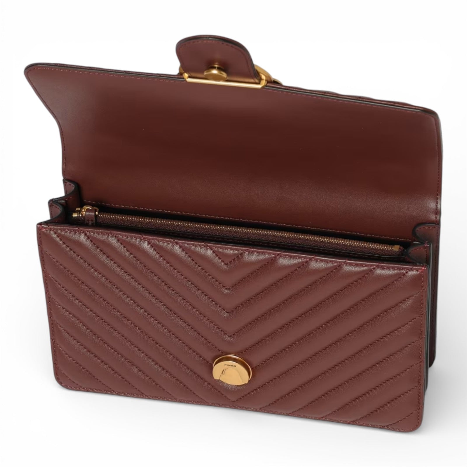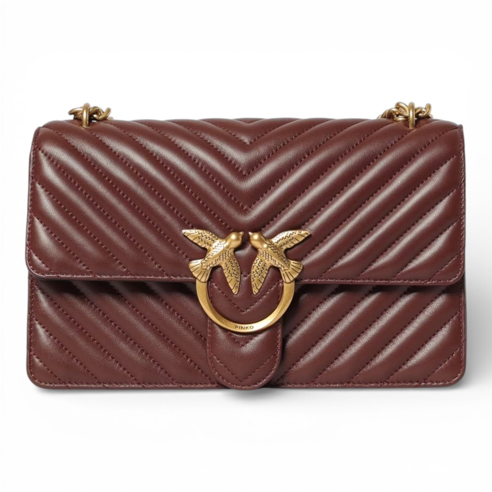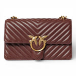 Classic Love Bag One in nappa trapuntata con motivo chevron. La chiusura è completata dall'iconica fibbia Love Birds Diamond Cut in metallo. L'interno è foderato in microfibra scamosciata e comprende tramezza chiusa con zip e tasca a parete in pelle. La tracolla combina la classica catena rotonda al pratico spallaccio in pelle regolabile.