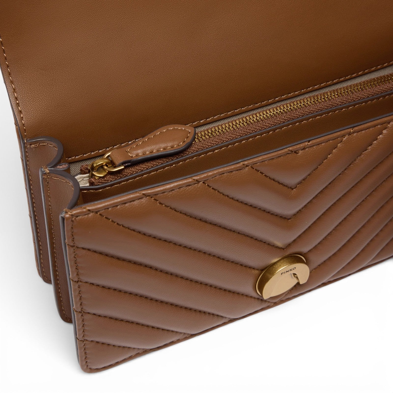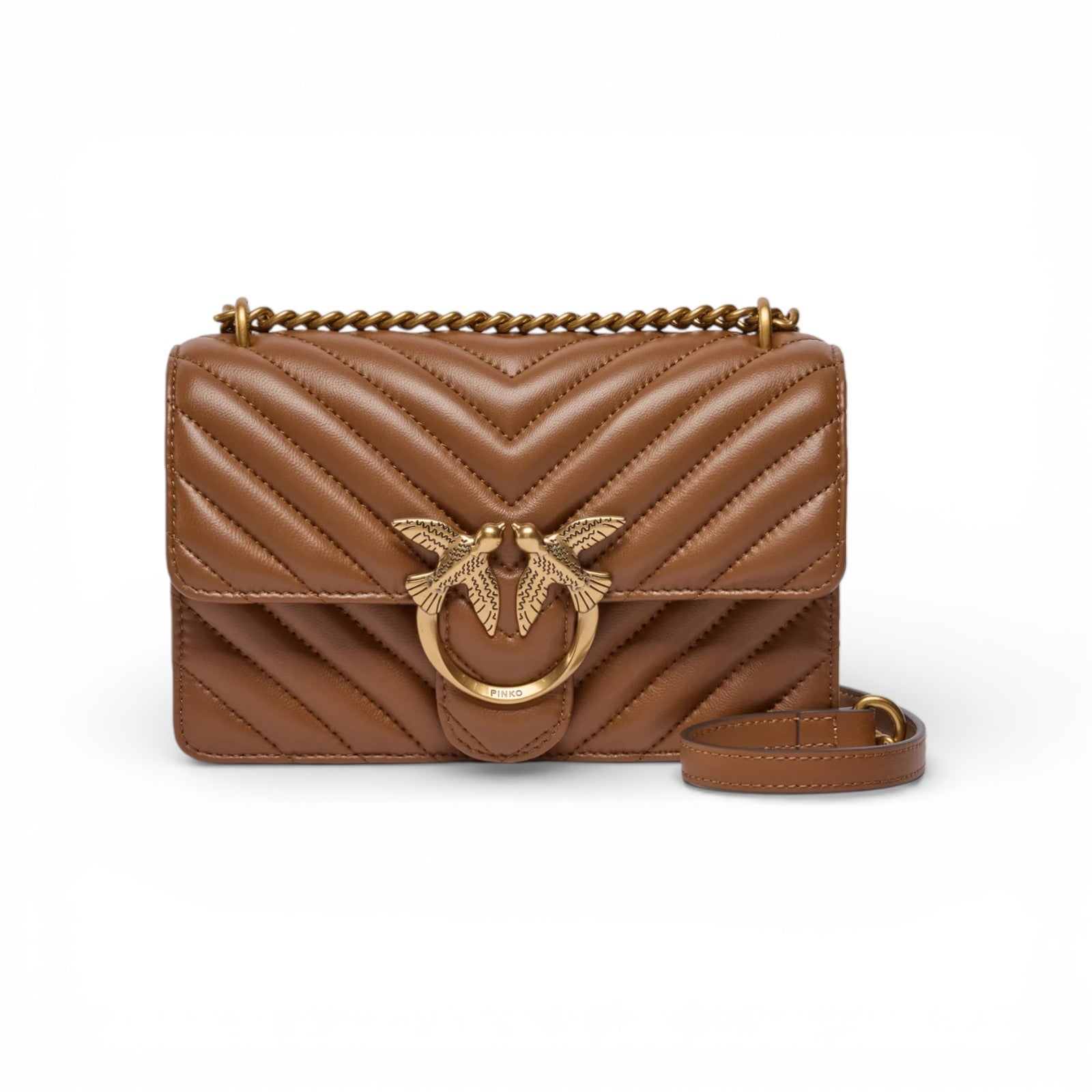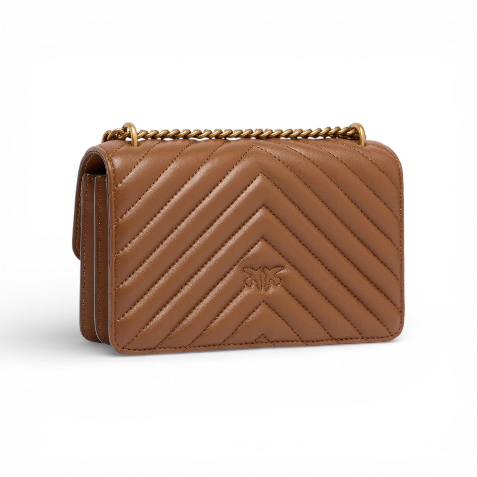 Mini Love Bag One in nappa trapuntata con motivo chevron. La chiusura è completata dall'iconica fibbia in metallo Love Birds Diamond Cut in metallo. L'interno è foderato in microfibra scamosciata e comprende tramezza chiusa con zip e tasca a parete in pelle. La tracolla combina la classica catena rotonda al pratico spallaccio in pelle regolabile.