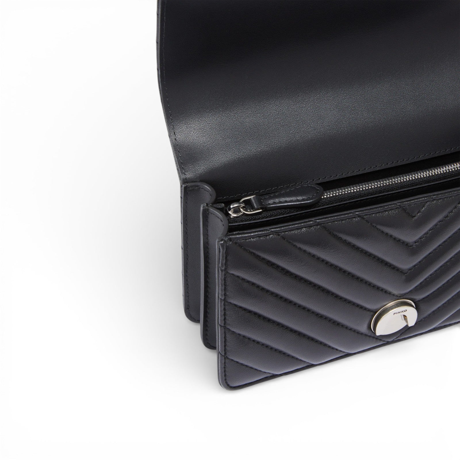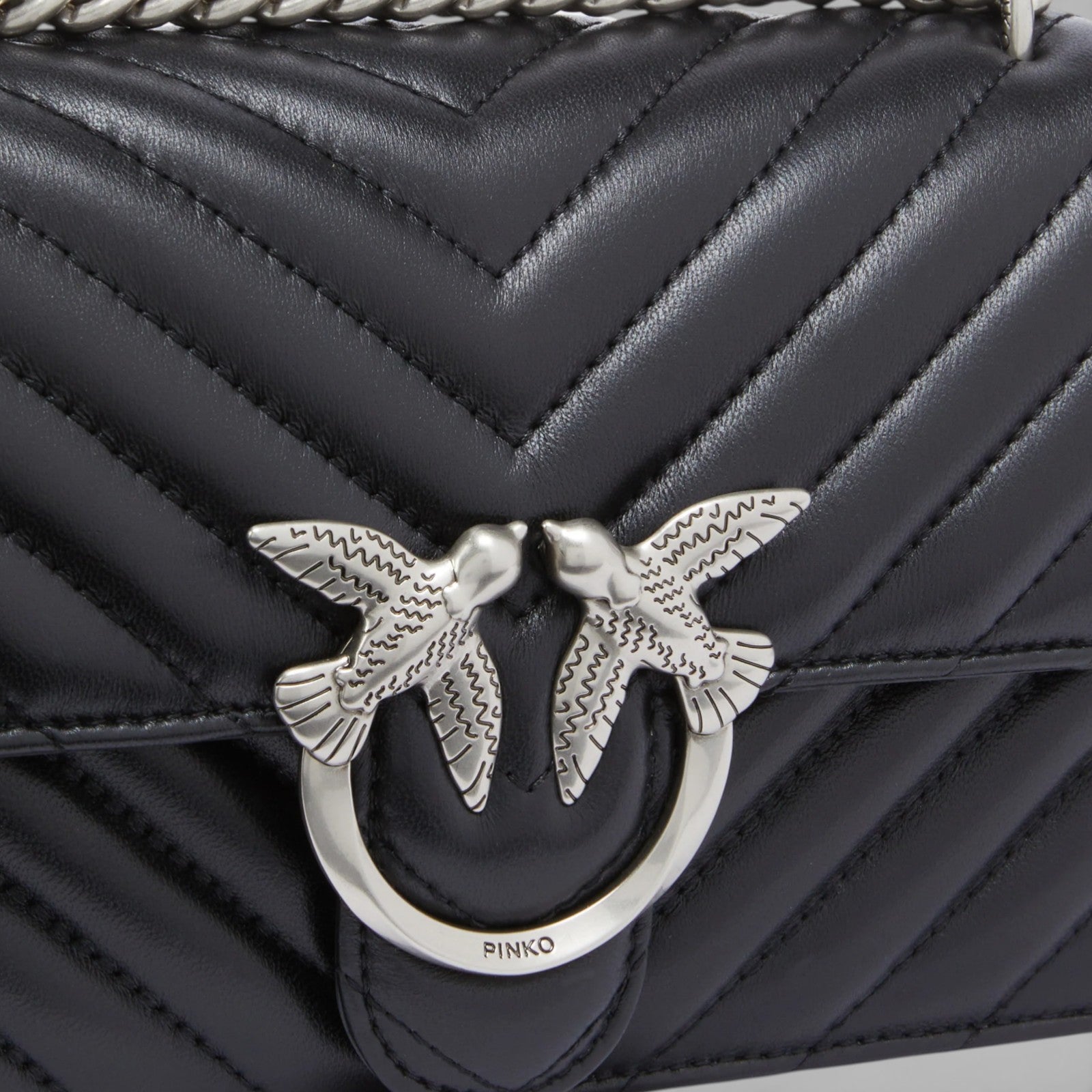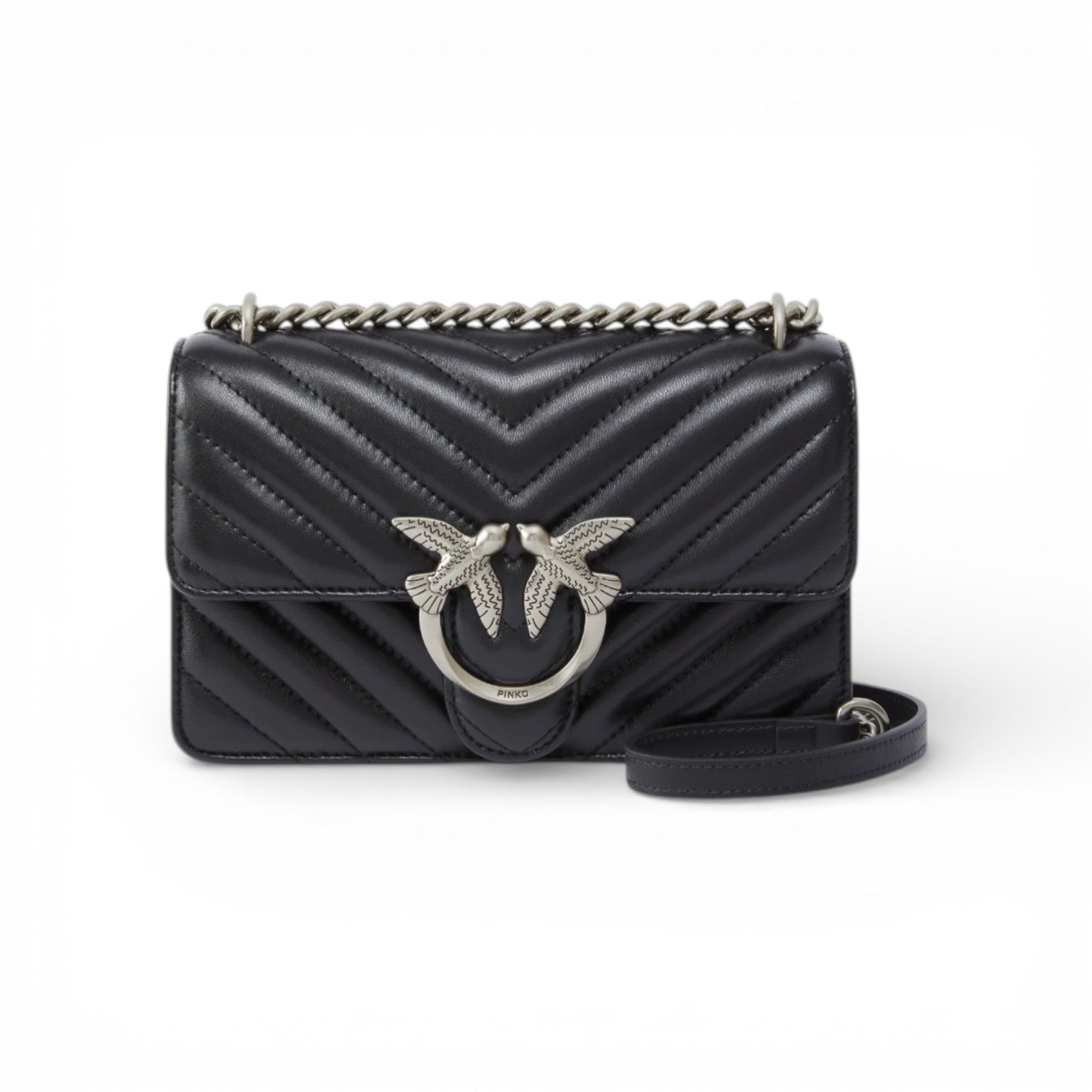 Mini Love Bag One in nappa trapuntata con motivo chevron. La chiusura è completata dall'iconica fibbia in metallo Love Birds Diamond Cut in metallo. L'interno è foderato in microfibra scamosciata e comprende tramezza chiusa con zip e tasca a parete in pelle. La tracolla combina la classica catena rotonda al pratico spallaccio in pelle regolabile.