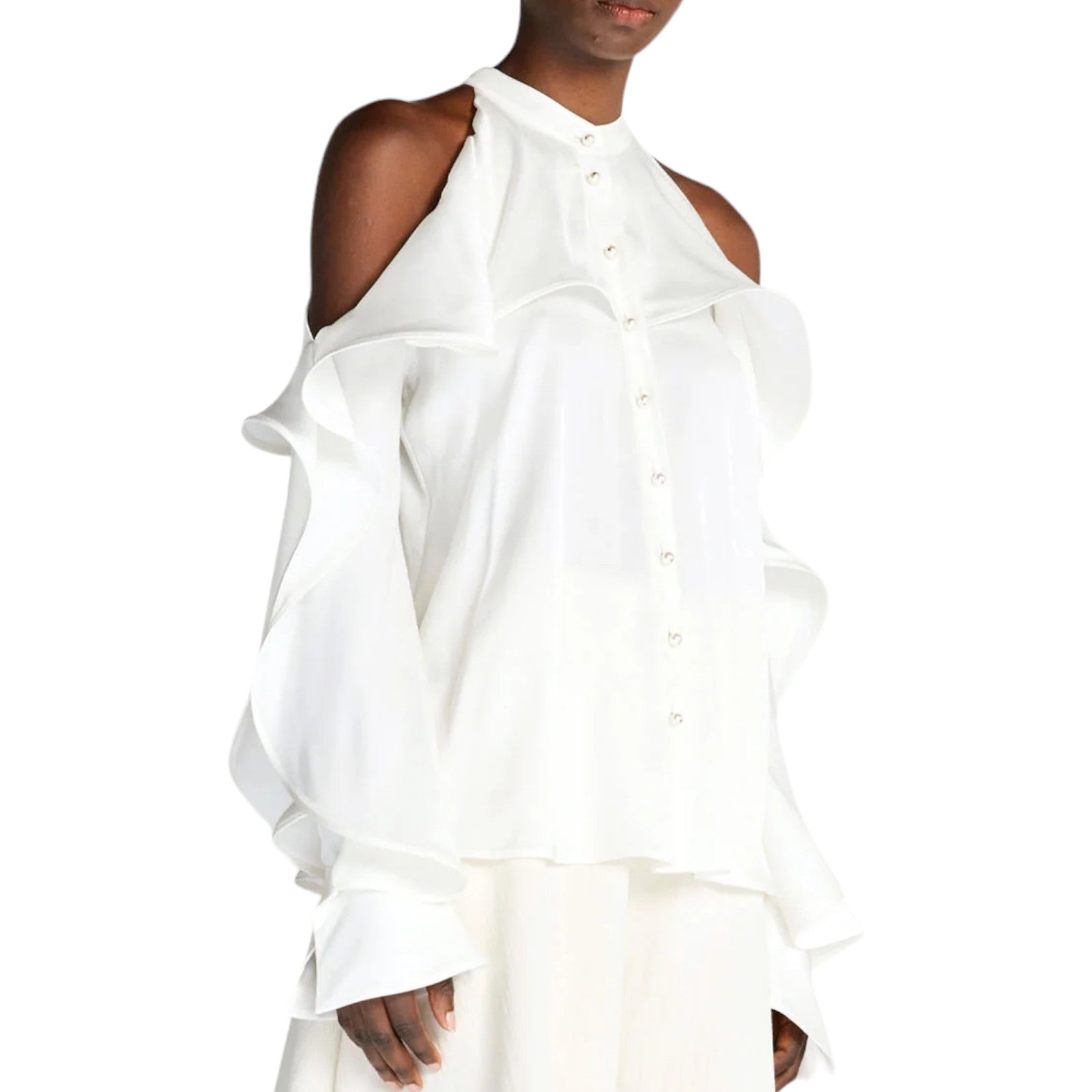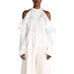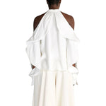 Blusa Glimmer in raso avorio.Balze a cascata si irradiano dalla scollatura anteriore e posteriore di questa blusa, creando una manica increspata effetto cascata.