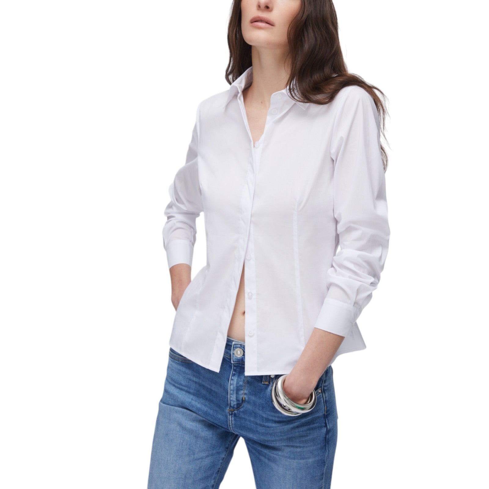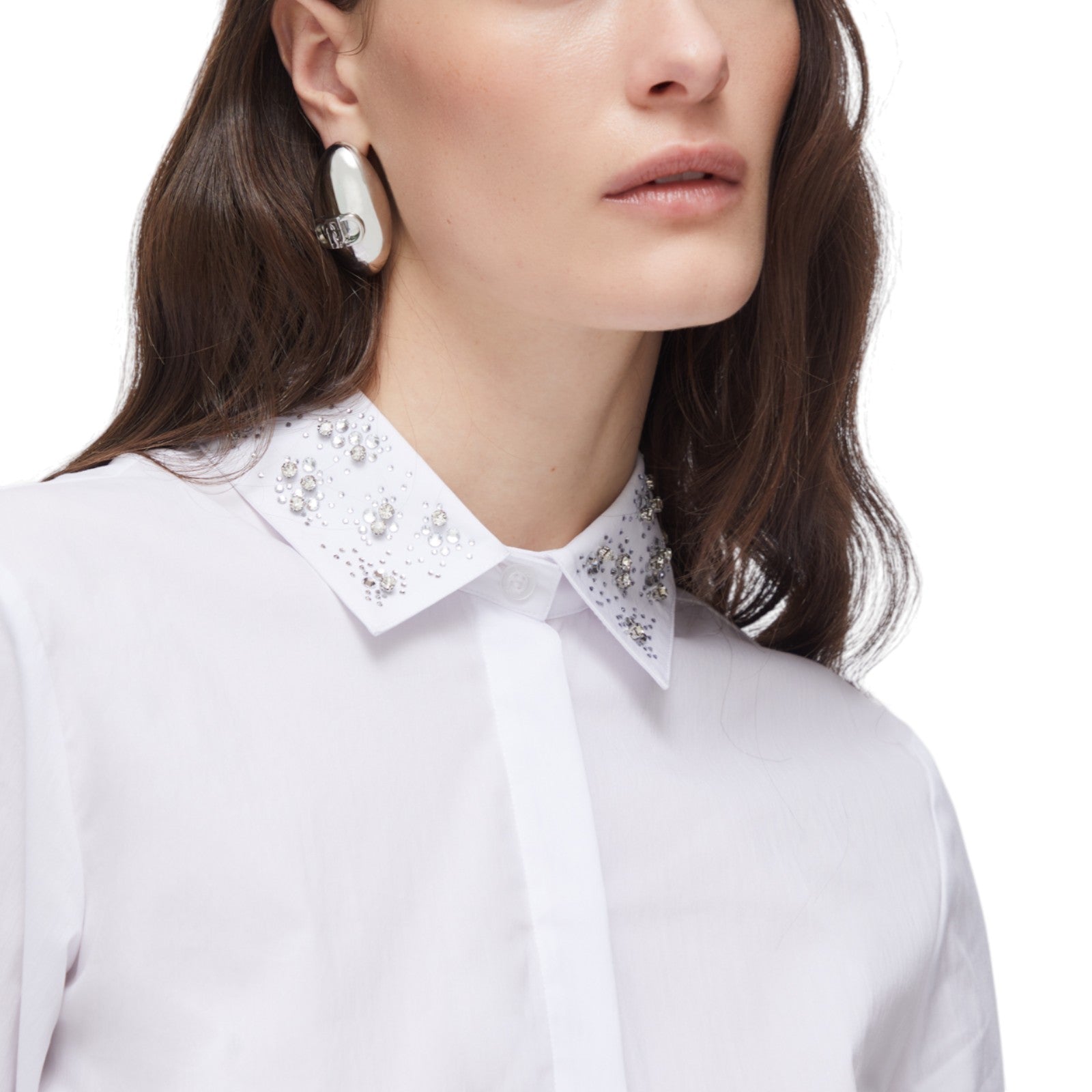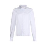 Camicia maniche lunghe in popeline. Colletto impreziosito da ricami gioiello. Chiusura frontale con bottoni nascosti. Slim fit.
