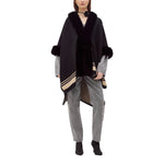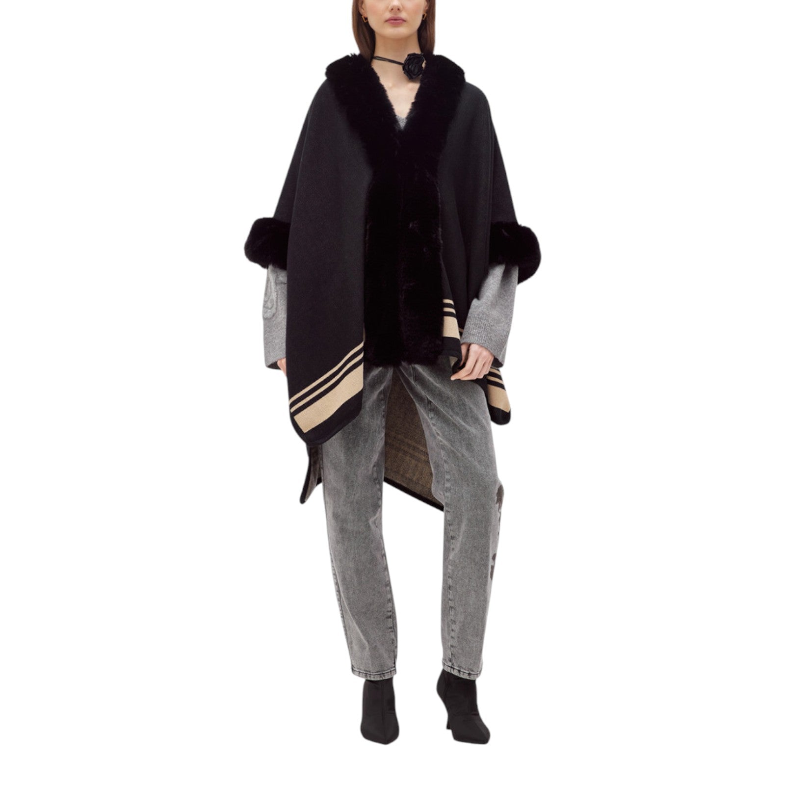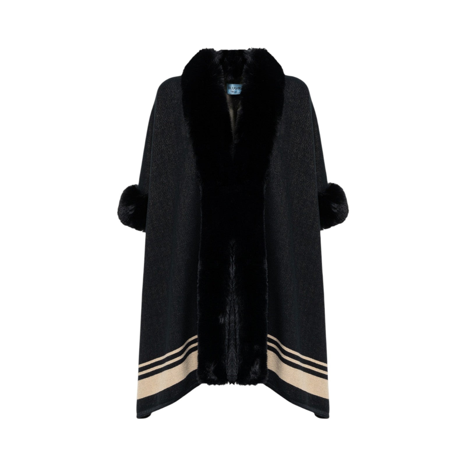 Cappa in maglia con profili rifiniti in faux fur. Ha scollatura a v, maniche a tre quarti, spacchi laterali e fondo con righe in colore a contrasto.