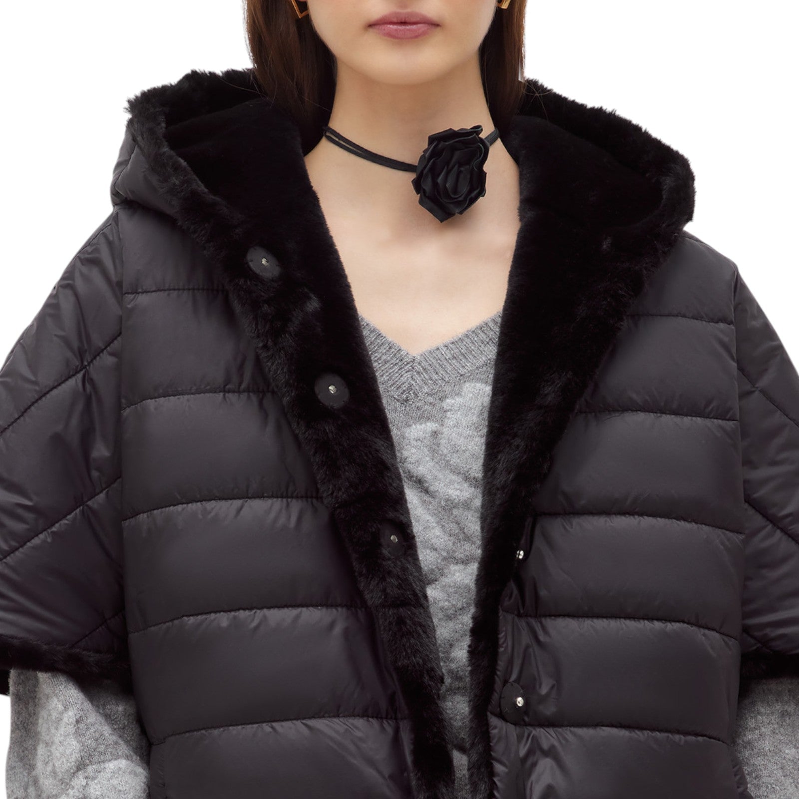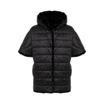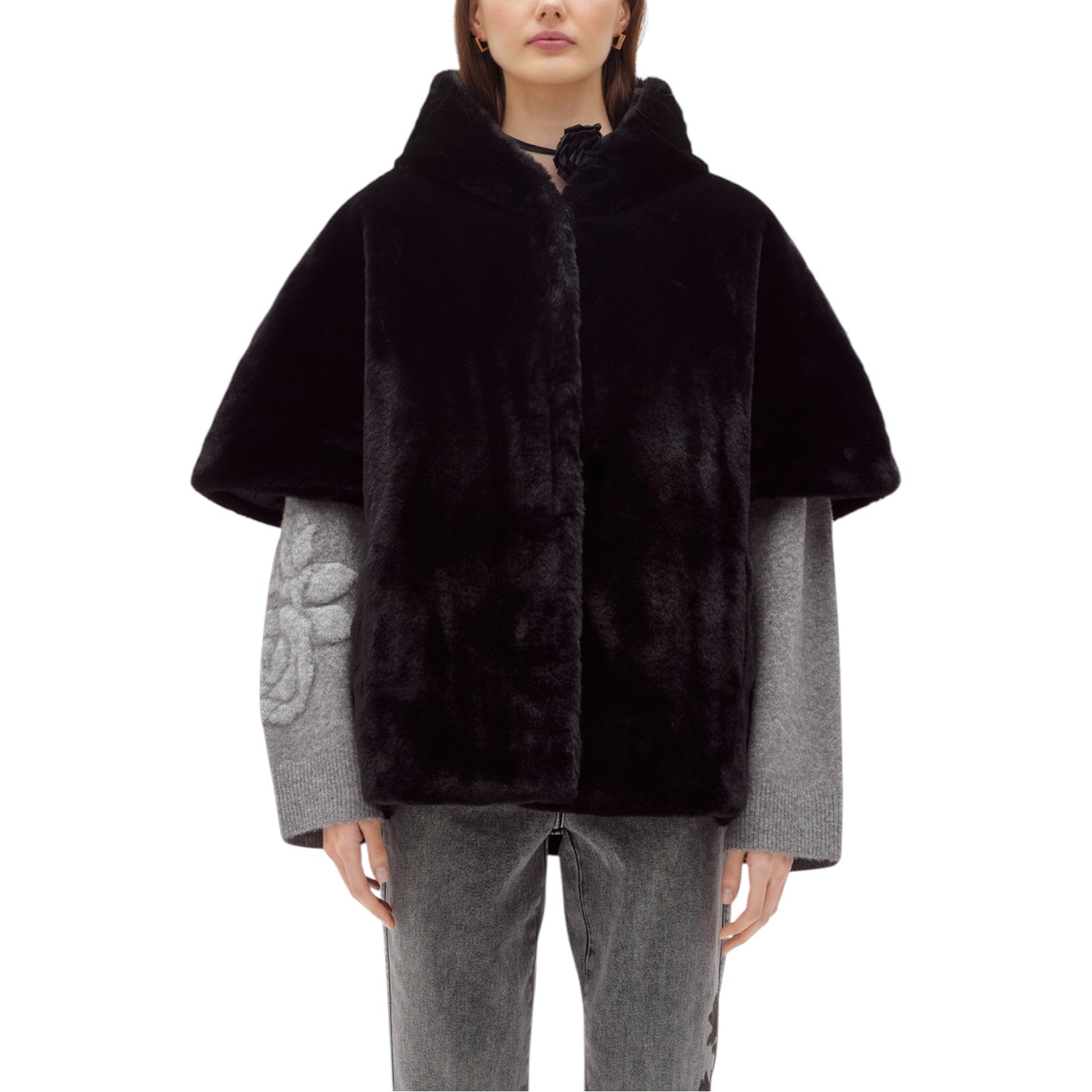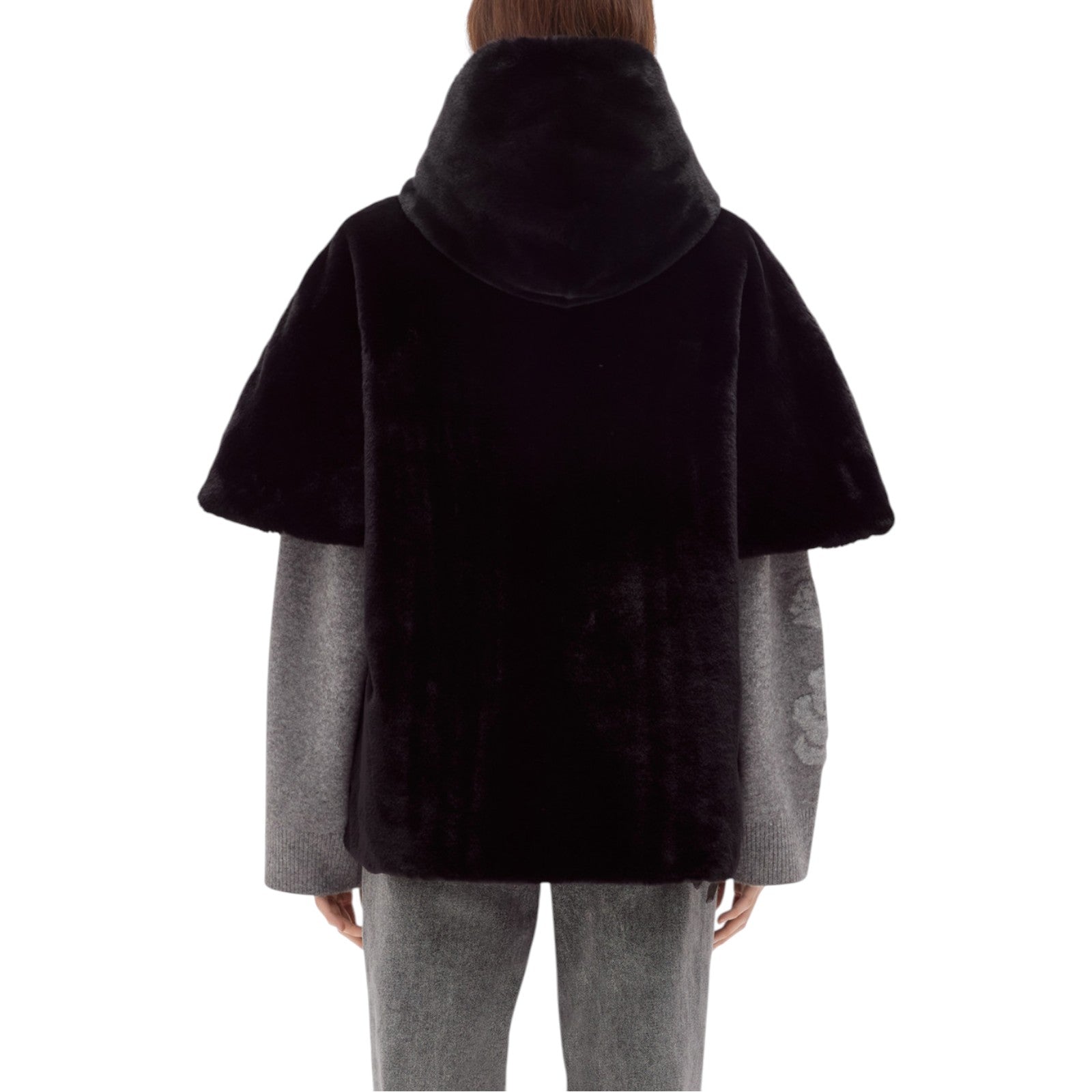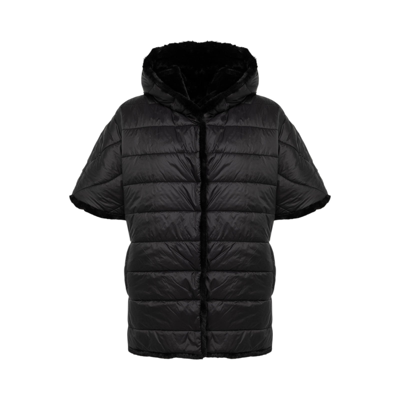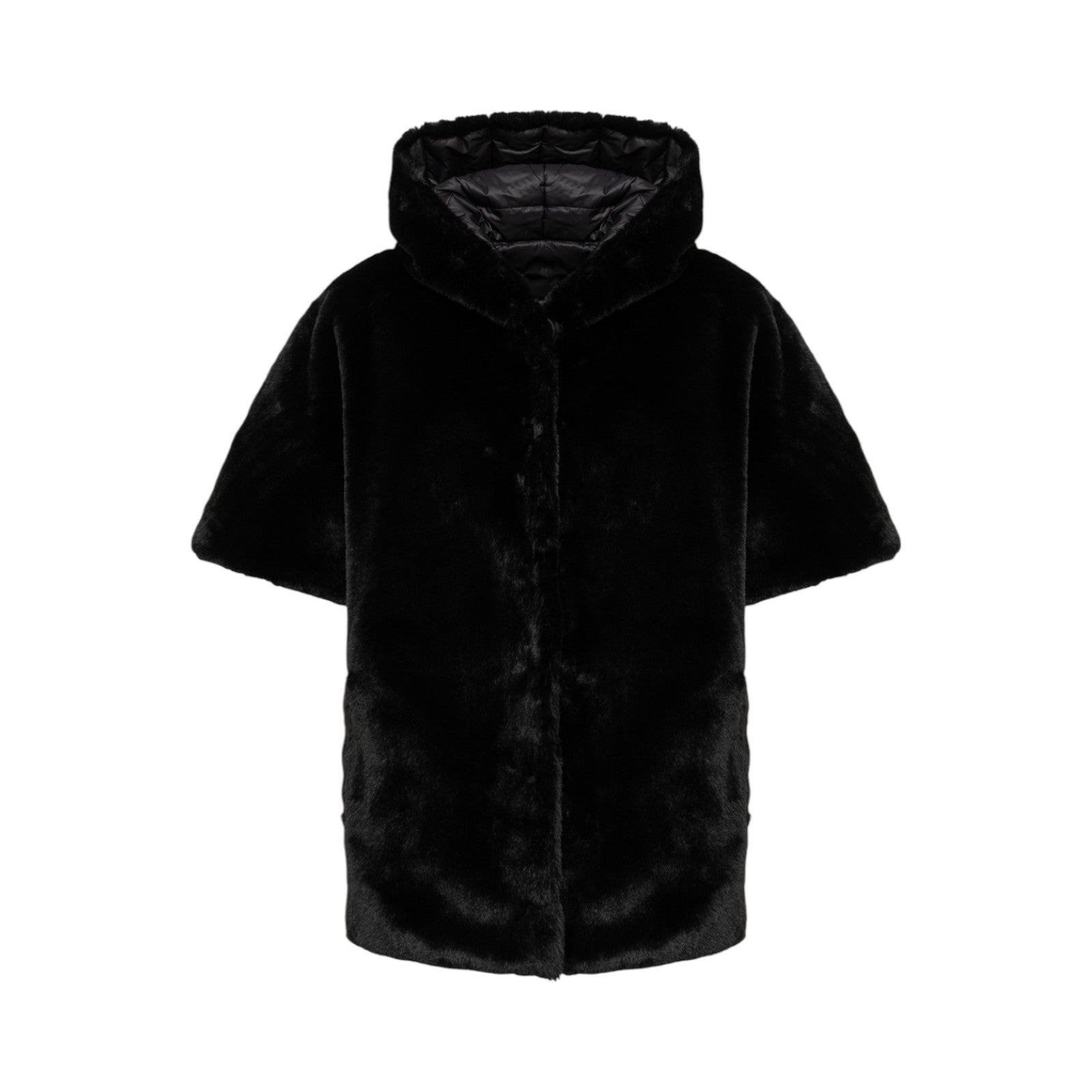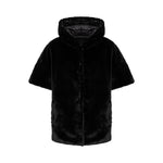 Cappa reversibile in faux fur realizzata con collo alto e cappuccio, maniche corte, chiusura monopetto con bottoni nascosti, tasche ai fianchi, foderata.