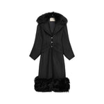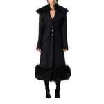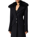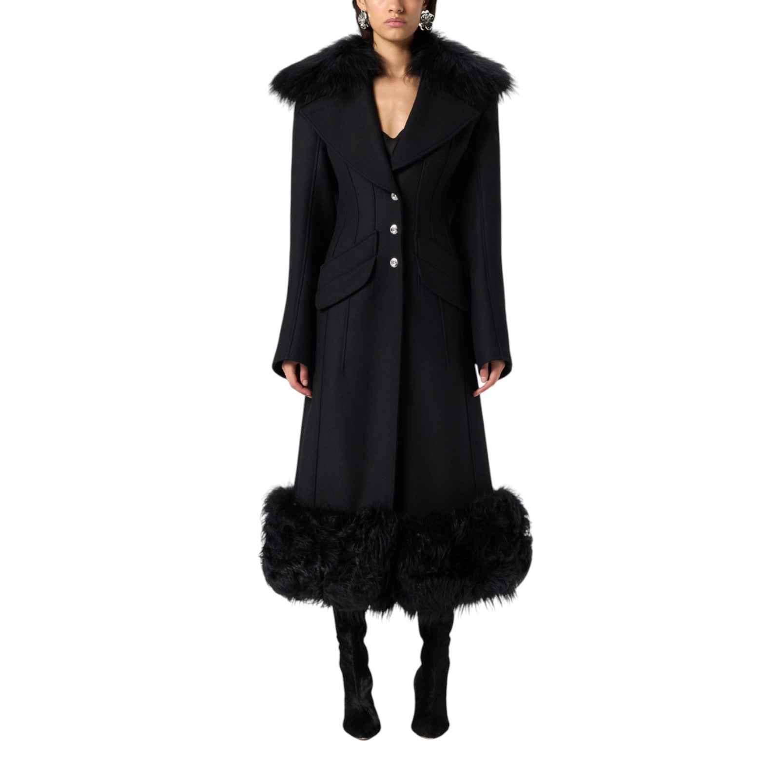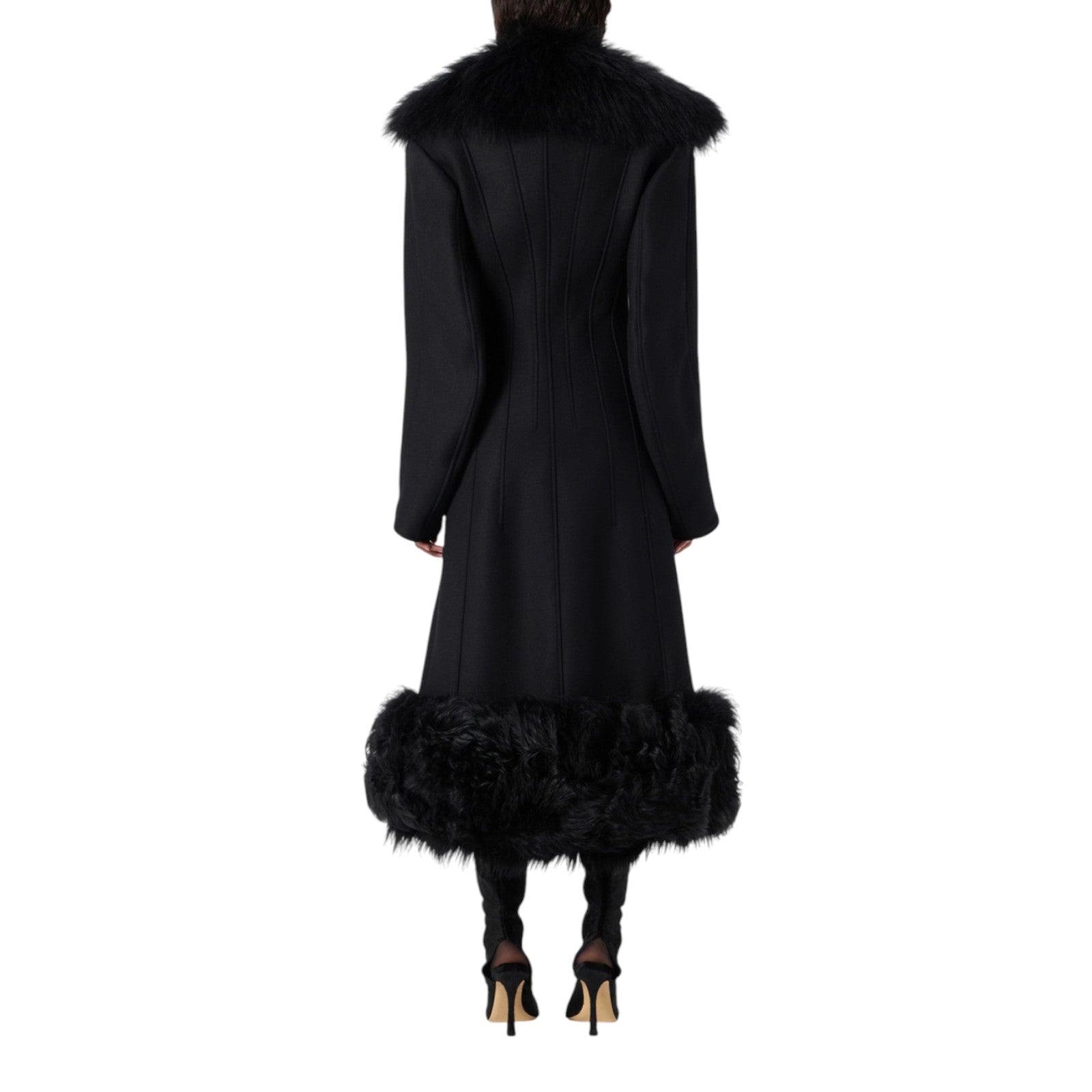Cappotto tailored in panno misto lana con colletto e fondo in pelliccia di agnello Alaba, impunture in vita, tasche a doppia patta.