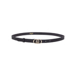 Cintura nera sottile da donna. Stampa effetto saffiano. Fibbia monogram in metallo. Chiusura regolabile.