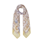 Foulard grande in tessuto stampato. Logo all-over. Busta logata in abbinamento.