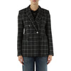 Collo a revers, maniche lunghe, chiusura doppiopetto con bottoni, taschino frontale, tasche frontali con patta, spalline imbottite, spacco sul retro, stampa a quadri, foderata.