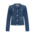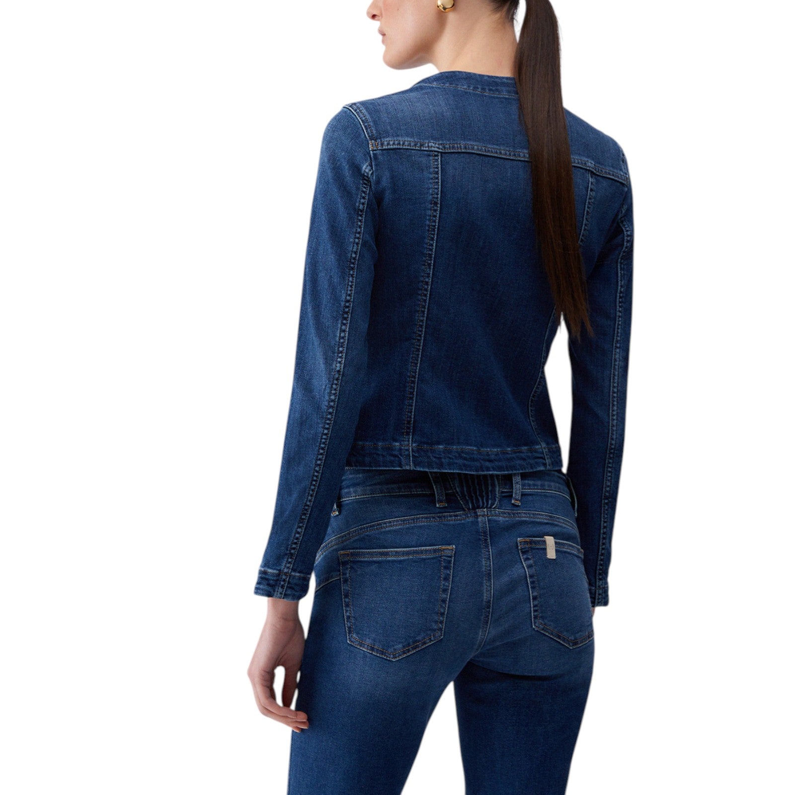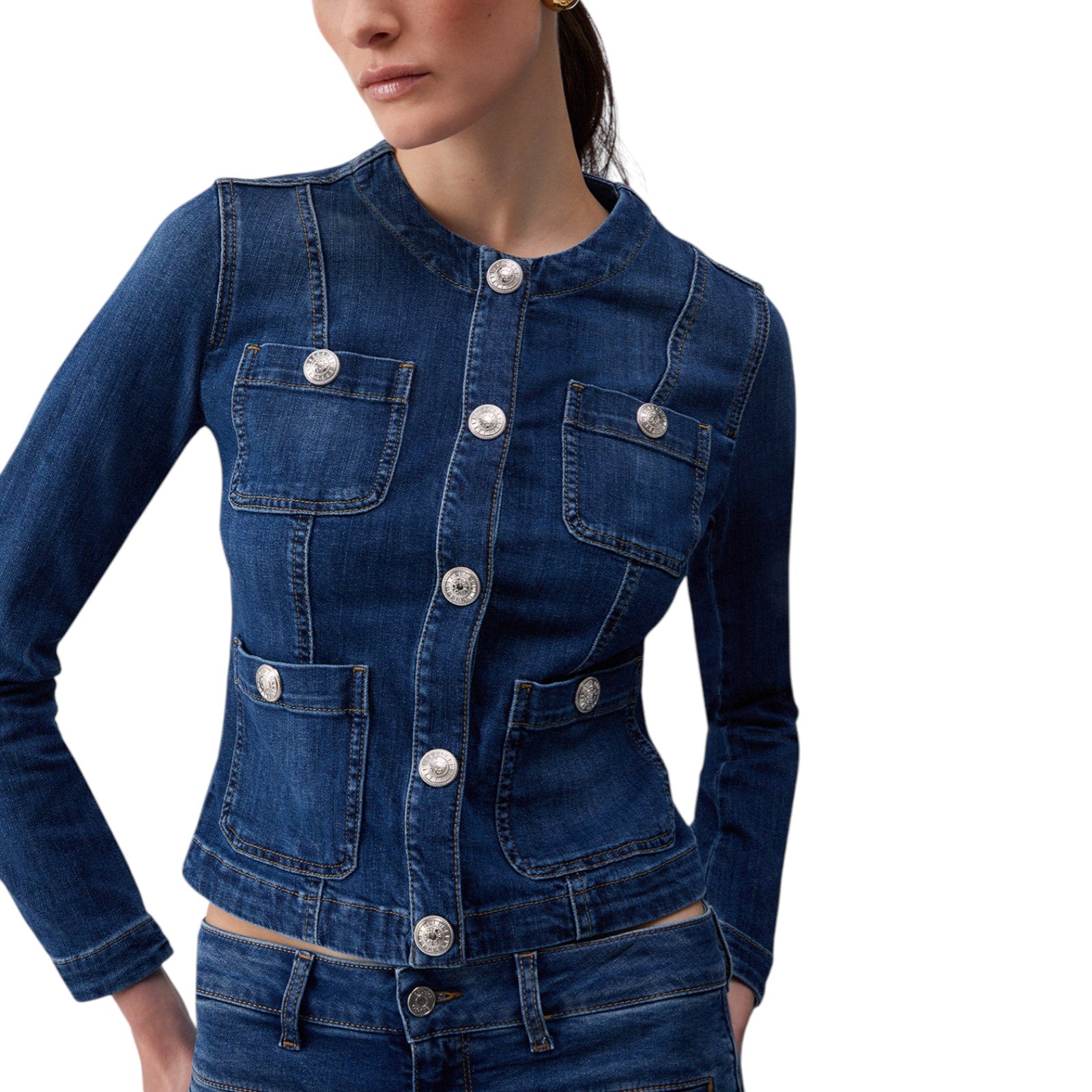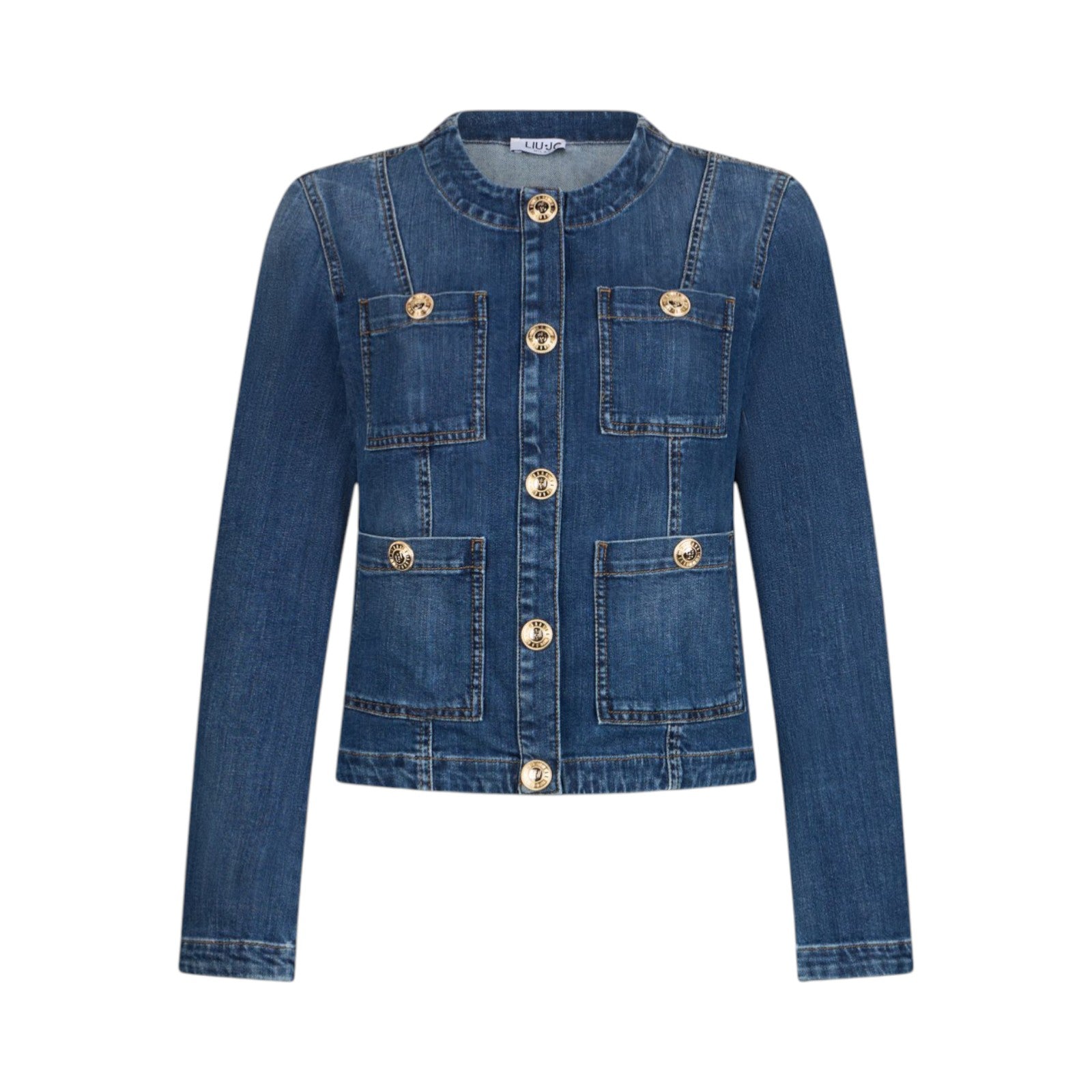 Giacca leggera in denim stretch. Lavaggio stonewash. Tasche applicate. Chiusura con bottoni logati.
