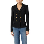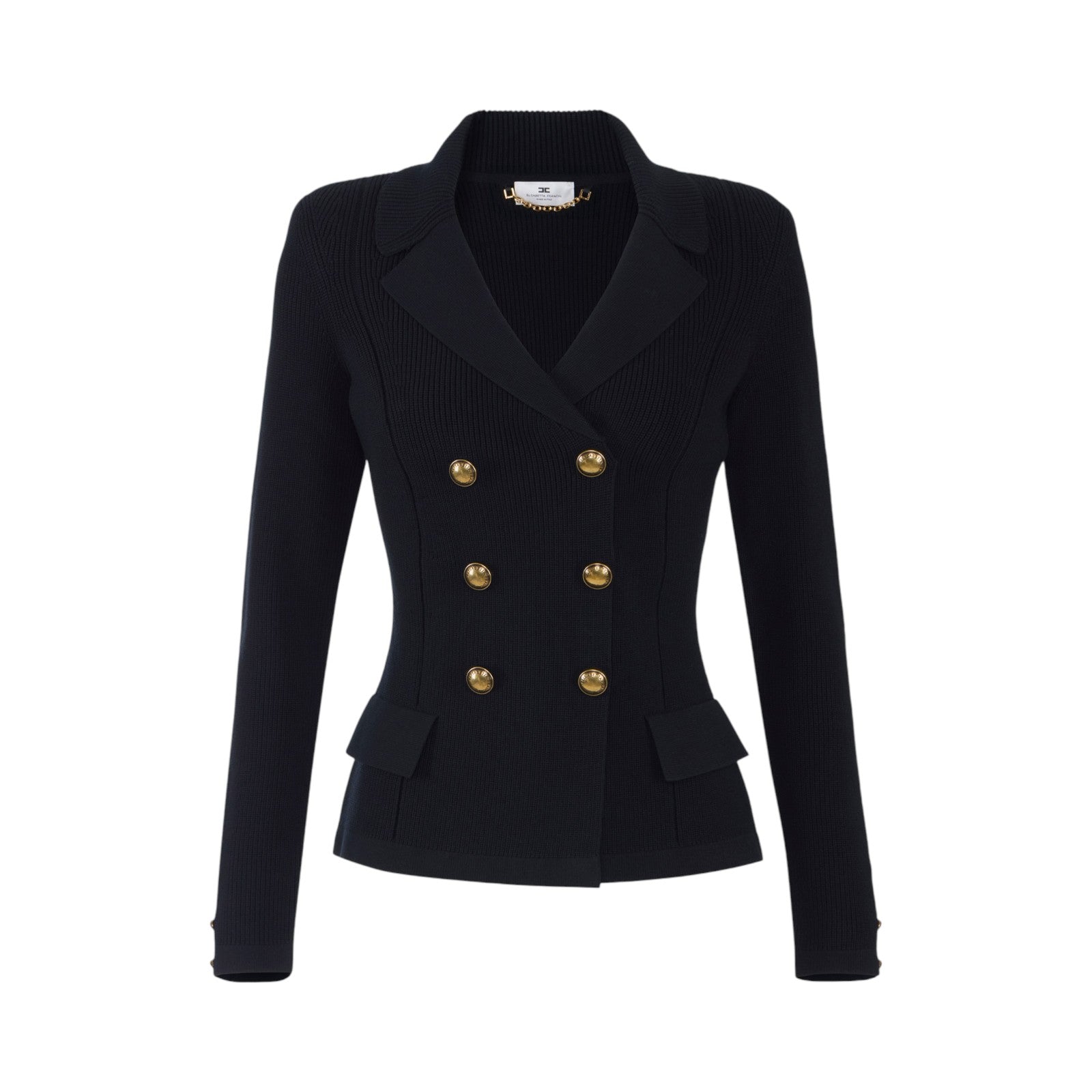 Giacca in maglia. Il blazer ha spalle strutturate e chiusura doppiopetto. La trama è avvolgente ma leggera al fit grazie alla meticolosa lavorazione a punto pannocchia. Rever e patte sono realizzati in tessuto a punto stoffa per uno studiato contrasto di texture. Bottoni con logo in metallo dorato per dettagli di luce. Vestibilità aderente.