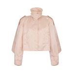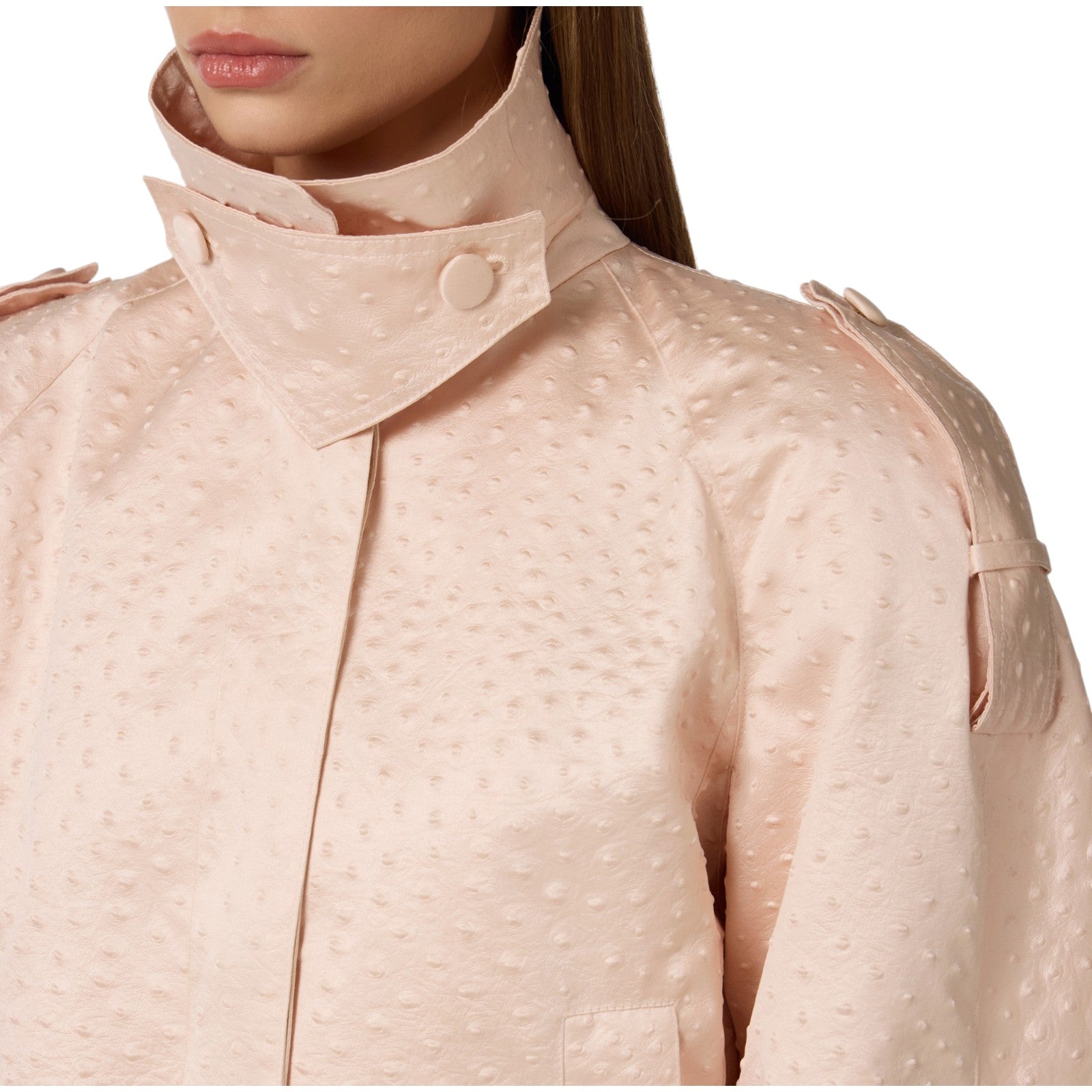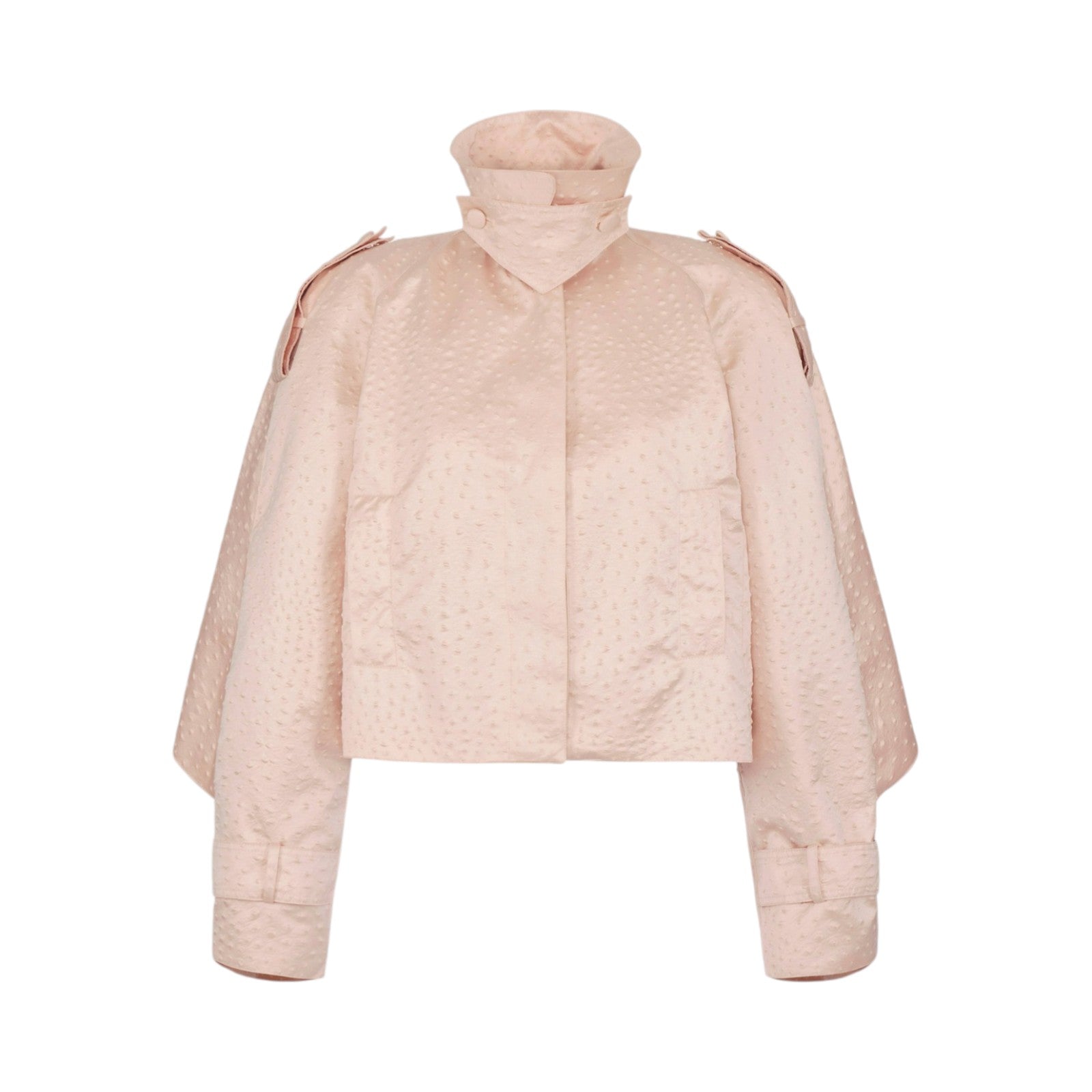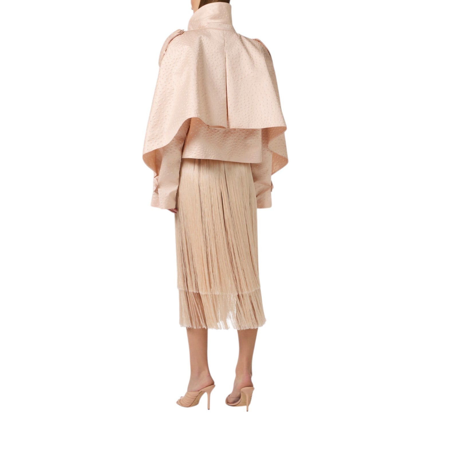 Giacca in taffettà con spalle strutturate, alamari, colletto con patta abbottonata. Si distingue per l'inedita stampa a rilievo con texture effetto struzzo e per la costruzione a mantella sul retro. Vestibilità regular.