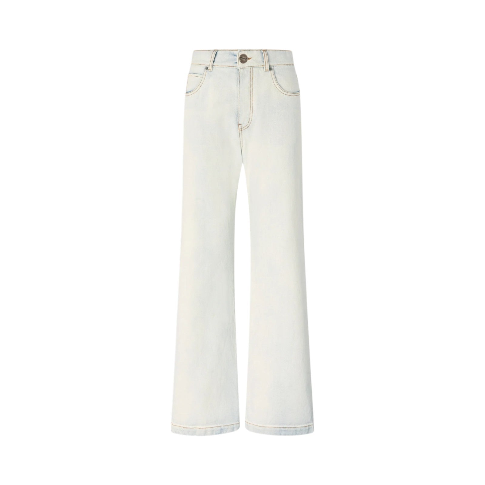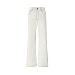Jeans cinque tasche da donna con silhouette wide leg dalla gamba dritta e ampia con fondo risvoltato fisso. Il capo è realizzato in denim di puro cotone con lavaggio super bleached per ottenere una tonalità bianco ottico su tutta la superficie, tranne per l'interno vita e il risvolto a fondo gamba, che creano così un effetto cromatico a contrasto. Grazie alla zip più corta, al gancio interno e al bottone a pressione il modello può essere indossato in due modi: a vita media, per un look più classico, o a vita bassa risvoltata per un raffinato tocco di originalità in puro stile PINKO.