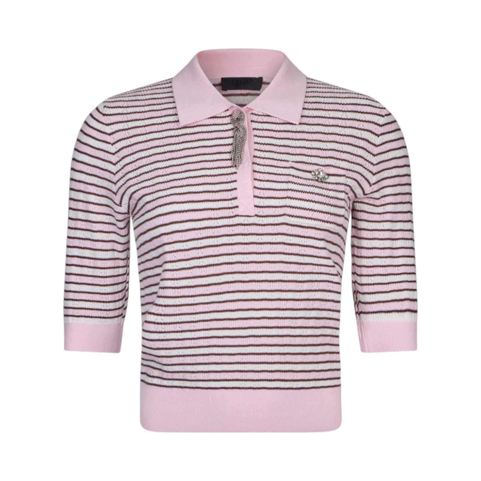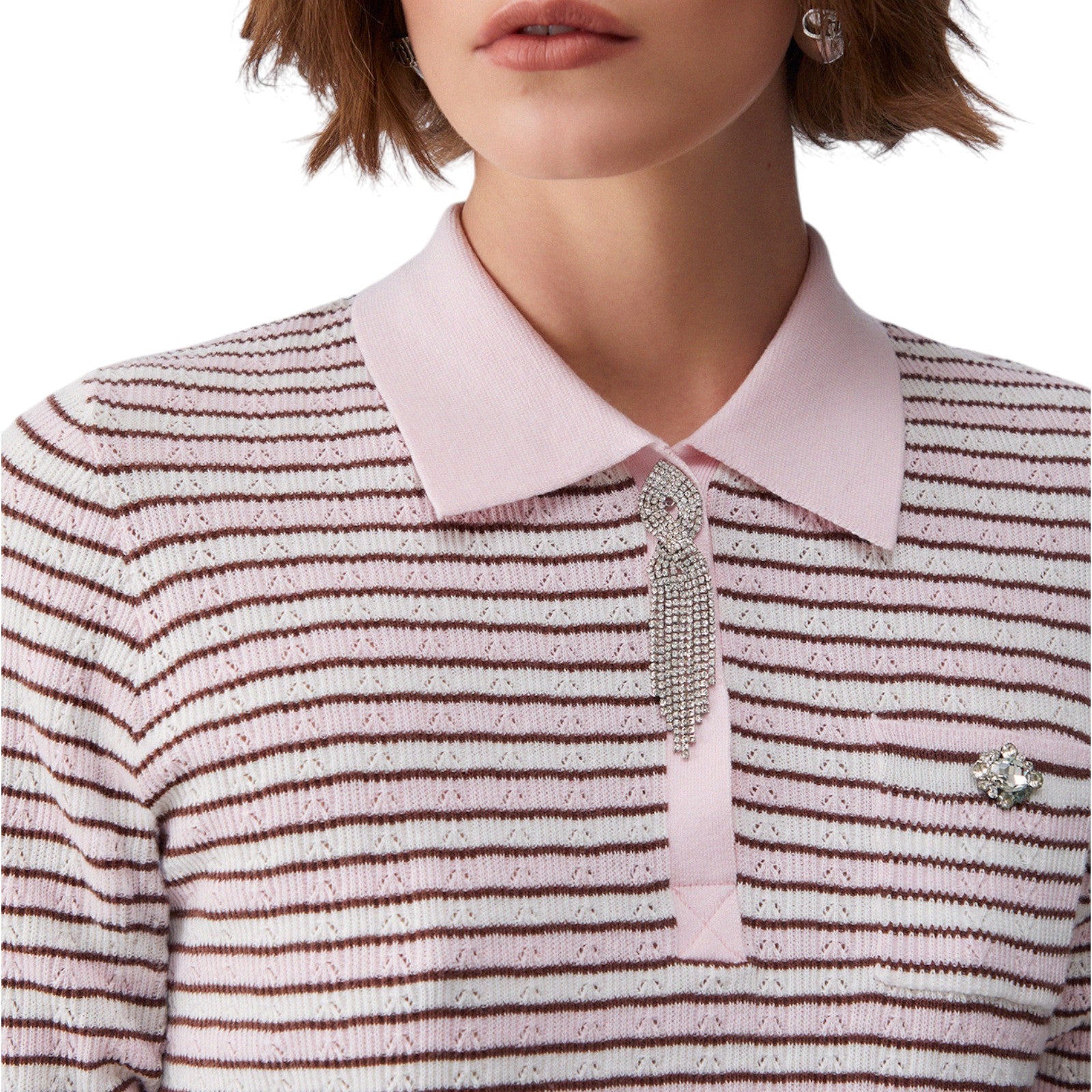 Maglia con filati in misto cotone e cashmere. Fantasia a righe. Spille gioiello. Colletto polo con chiusura a bottoni. Maniche corte.
